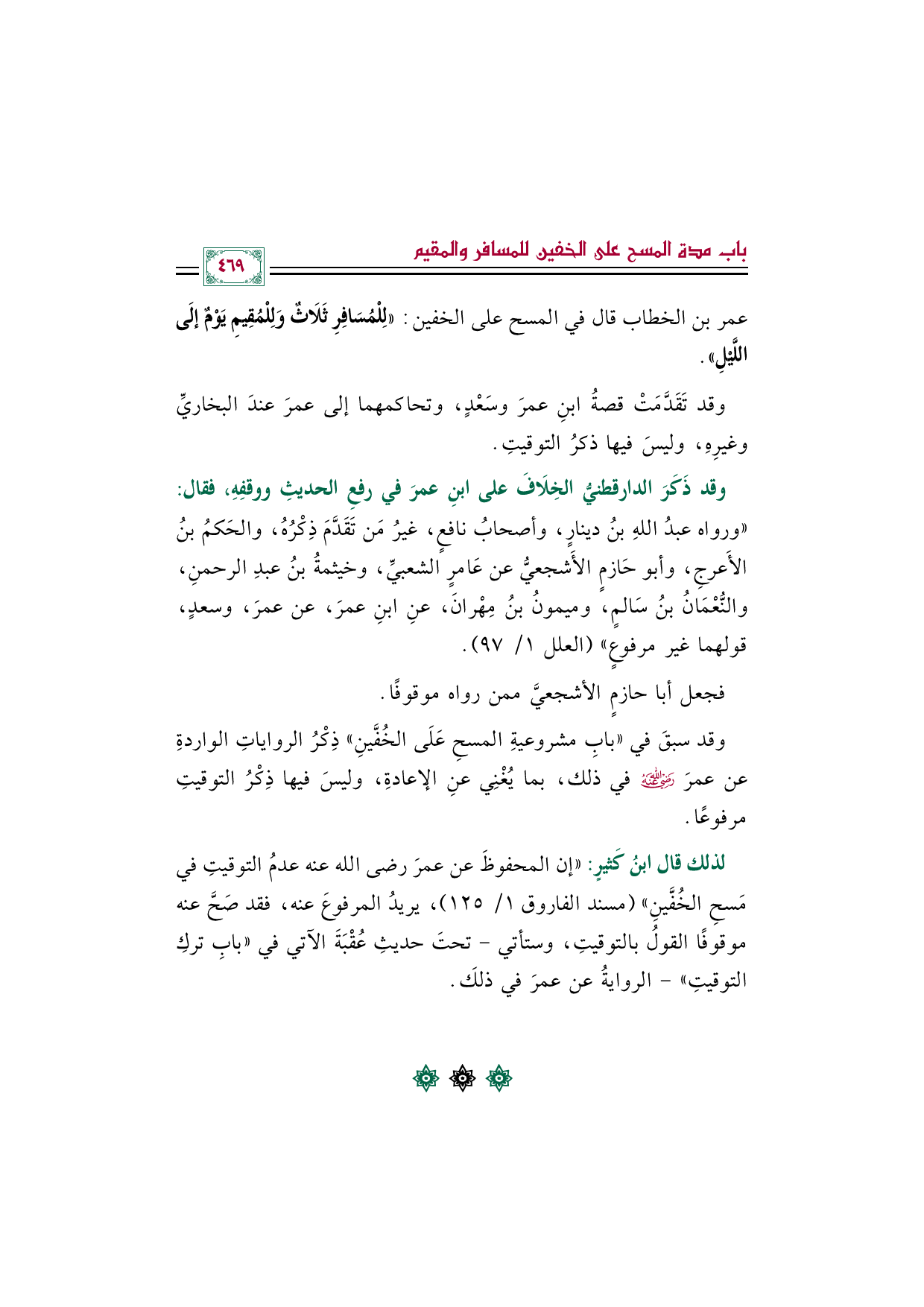 لذلك قال ابنُ كثيرٍ: "إن المحفوظَ عن عمرَ رضى الله عنه عدمُ التوقيتِ في مسحِ الخُفَّينِ" (مسند الفاروق ١/ ١٢٥)، يريدُ المرفوعَ عنه، فقد صَحَّ عنه موقوفًا القولُ بالتوقيتِ، وستأتي -تحتَ حديثِ عقبة الآتي في "بابِ تركِ التوقيتِ"- الروايةُ عن عمرَ في ذلكَ.