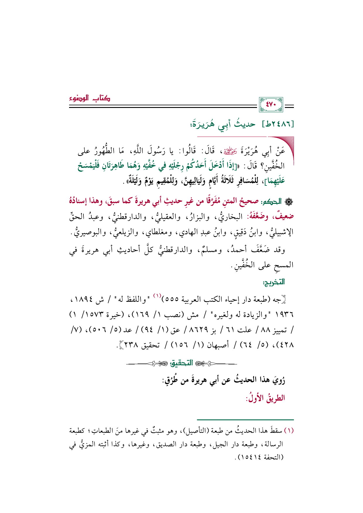 وقد ضَعَّفَ أحمدُ، ومسلمٌ، والدارقطنيُّ كلَّ أحاديثِ أبي هريرةَ في المسحِ على الخُفَّينِ.