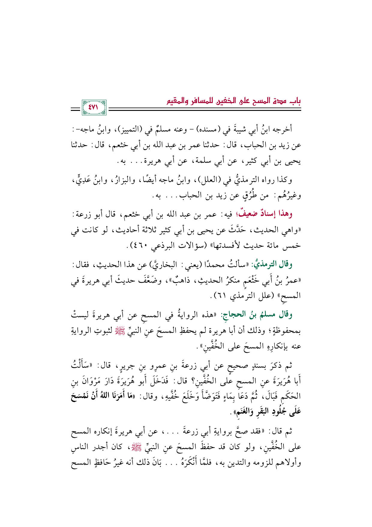 وقال الترمذيُّ: ((سألتُ محمدًا (يعني: البخاريَّ) عن هذا الحديثِ، فقال: "عمرُ بنُ أَبي خَثْعَمٍ منكرُ الحديثِ، ذاهبٌ"، وضَعَّفَ حديثَ أبي هريرةَ في المسحِ)) (علل الترمذي ٦١).