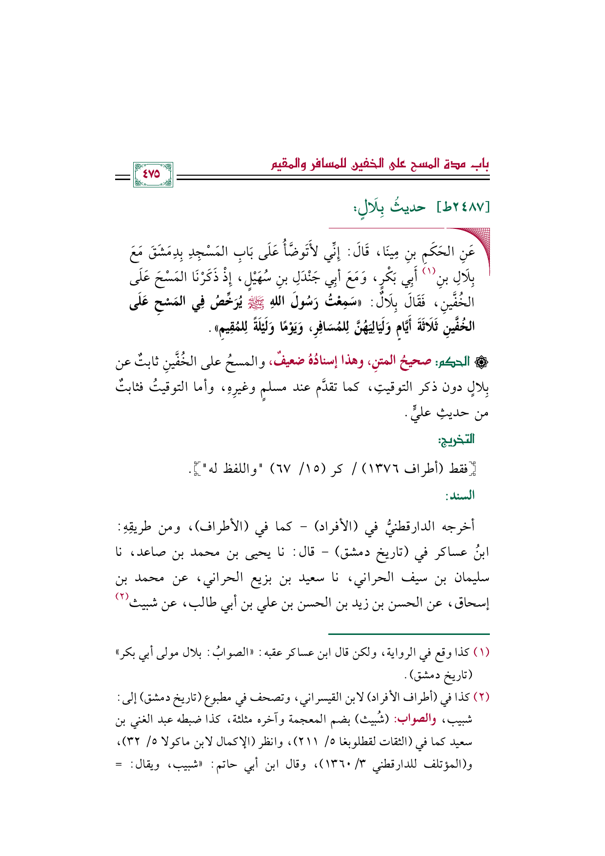 [الحكم]: صحيحُ المتنِ، وهذا إسنادُهُ ضعيفٌ، والمسحُ على الخُفَّينِ ثابتٌ عن بِلالٍ دون ذكر التوقيتِ، كما تقدَّم عند مسلمٍ وغيرِهِ، وأما التوقيتُ فثابتٌ من حديثِ عليٍّ.