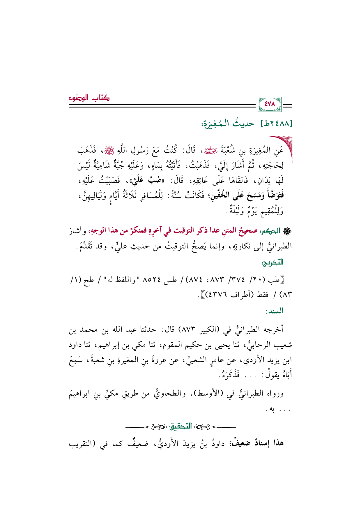 أخرجه الطبرانيُّ في (الكبير ٨٧٣) قال: حدثنا عبد الله بن محمد بن شعيب الرحابيُّ، ثنا يحيى بن حكيم المقوم، ثنا مكي بن إبراهيم، ثنا داود بن يزيد الأودي، عن عامرٍ الشعبيِّ، عن عروةَ بنِ المغيرةِ بنِ شعبةَ، سَمِعَ أَبَاهُ يقولُ: ... فَذَكَرَهُ.