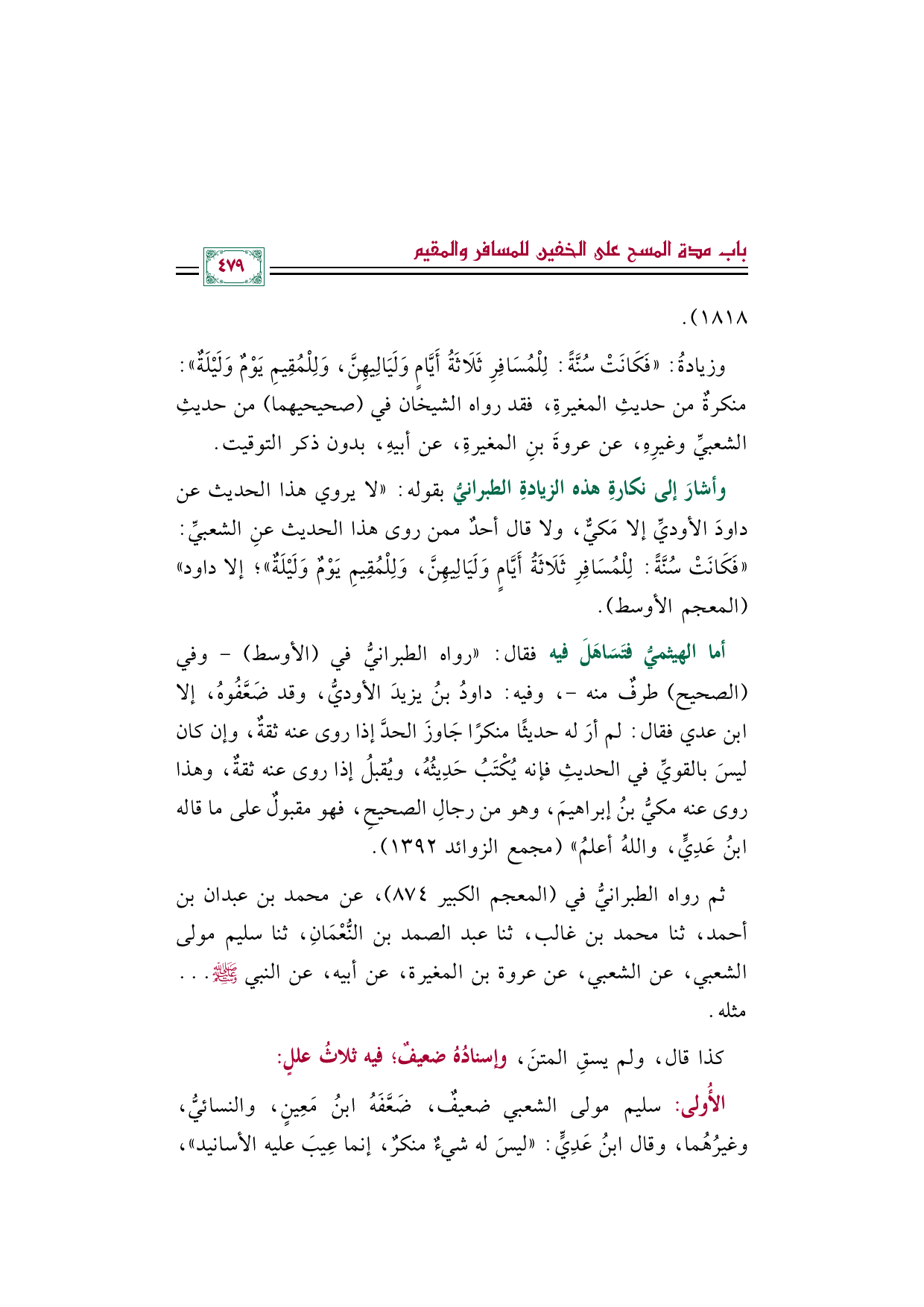 وأشارَ إلى نكارةِ هذه الزيادةِ الطبرانيُّ بقوله: "لا يروي هذا الحديث عن داود الأودي إلا مكيٌّ، ولا قال أحدٌ ممن روى هذا الحديث عنِ الشعبيِّ: ((فَكَانَتْ سُنَّةً: لِلْمُسَافِرِ ثَلَاثَةُ أَيَّامٍ وَلَيَالِيهِنَّ، وَلِلْمُقِيمِ يَوْمٌ وَلَيْلَةٌ))؛ إلا داود" (المعجم الأوسط).