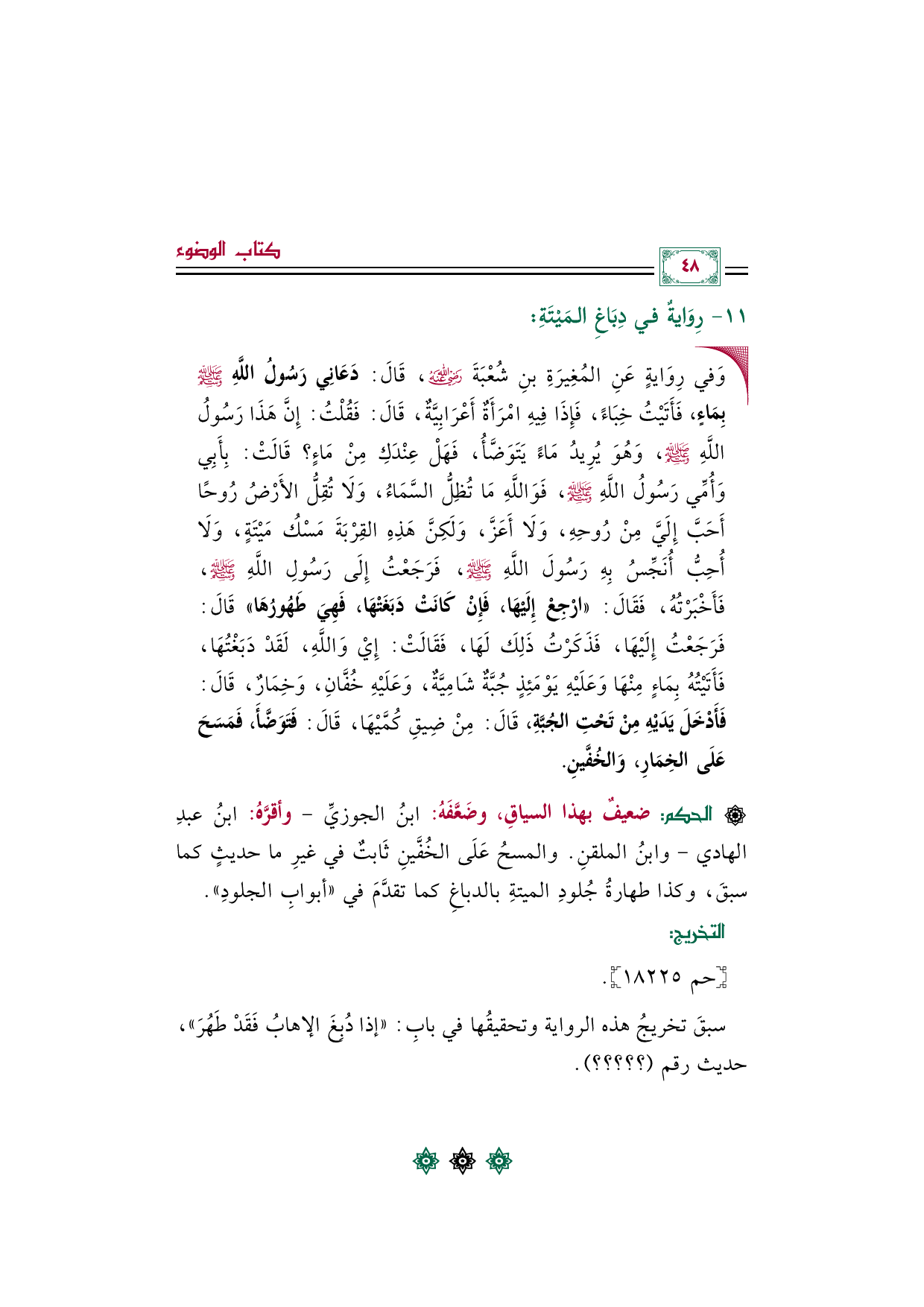 • وَفي رِوَايةٍ عَنِ المُغِيرَةِ بنِ شُعْبَةَ رضي الله عنه، قَالَ: دَعَانِي رَسُولُ اللَّهِ صلى الله عليه وسلم بِمَاءٍ، فَأَتَيْتُ خِبَاءً، فَإِذَا فِيهِ امْرَأَةٌ أَعْرَابِيَّةٌ، قَالَ: فَقُلْتُ: إِنَّ هَذَا رَسُولُ اللَّهِ صلى الله عليه وسلم، وَهُوَ يُرِيدُ مَاءً يَتَوَضَّأُ، فَهَلْ عِنْدَكِ مِنْ مَاءٍ؟ قَالَتْ: بِأَبِي وَأُمِّي رَسُولُ اللَّهِ صلى الله عليه وسلم، فَوَاللَّهِ مَا تُظِلُّ السَّمَاءُ، وَلَا تُقِلُّ الأَرْضُ رُوحًا أَحَبَّ إِلَيَّ مِنْ رُوحِهِ، وَلَا أَعَزَّ، وَلَكِنَّ هَذِهِ القِرْبَةَ مَسْكُ مَيْتَةٍ، وَلَا أُحِبُّ أُنَجِّسُ بِهِ رَسُولَ اللَّهِ صلى الله عليه وسلم، فَرَجَعْتُ إِلَى رَسُولِ اللَّهِ صلى الله عليه وسلم، فَأَخْبَرْتُهُ، فَقَالَ: ((ارْجِعْ إِلَيْهَا، فَإِنْ كَانَتْ دَبَغَتْهَا، فَهِيَ طَهُورُهَا)) قَالَ: فَرَجَعْتُ إِلَيْهَا، فَذَكَرْتُ ذَلِكَ لَهَا، فَقَالَتْ: إِيْ وَاللَّهِ، لَقَدْ دَبَغْتُهَا، فَأَتَيْتُهُ بِمَاءٍ مِنْهَا وَعَلَيْهِ يَوْمَئِذٍ جُبَّةٌ شَامِيَّةٌ، وَعَلَيْهِ خُفَّانِ، وَخِمَارٌ، قَالَ: فَأَدْخَلَ يَدَيْهِ مِنْ تَحْتِ الجُبَّةِ، قَالَ: مِنْ ضِيقِ كُمَّيْهَا، قَالَ: فَتَوَضَّأَ، فَمَسَحَ عَلَى الخِمَارِ، وَالخُفَّينِ.