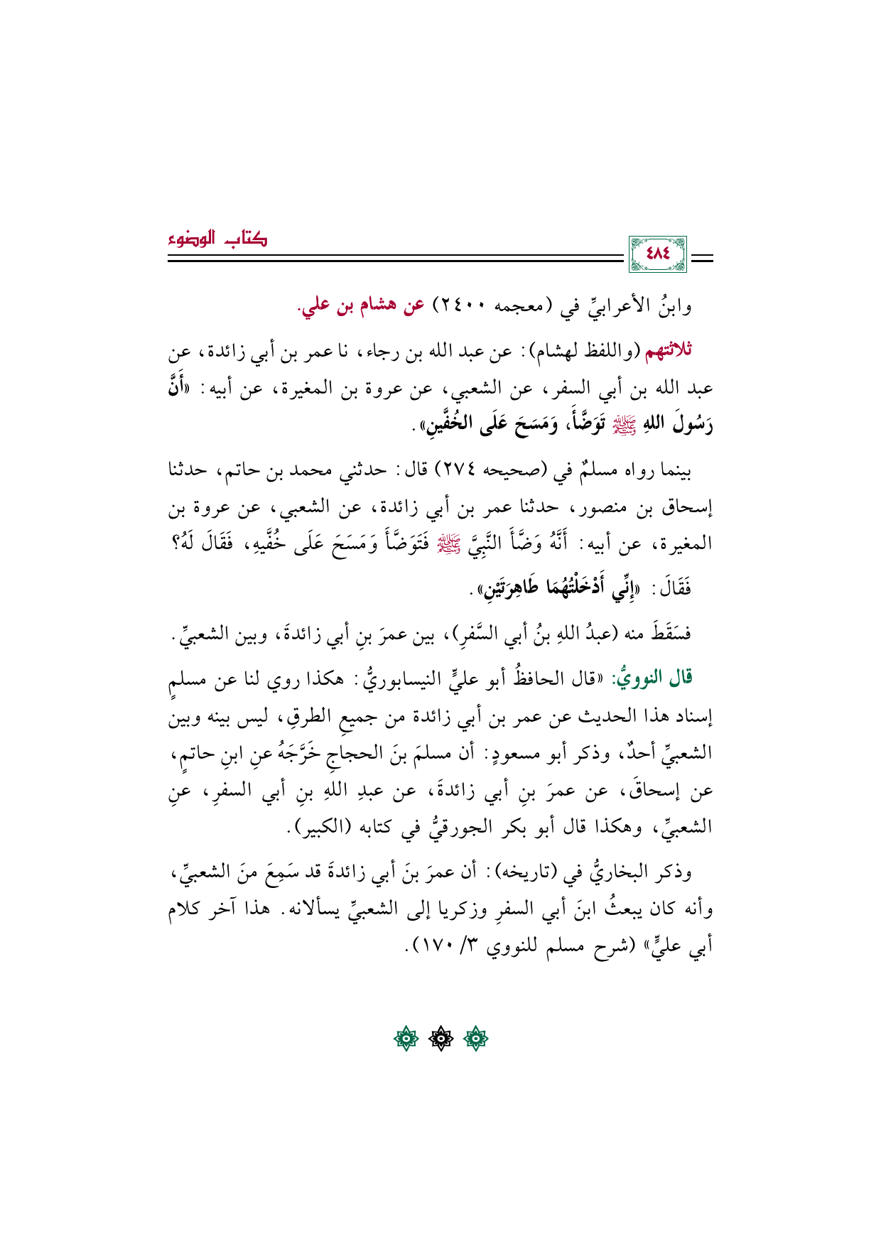 بينما رواه مسلمٌ في (صحيحه ٢٧٤) قال: حدثني محمد بن حاتم، حدثنا إسحاق بن منصور، حدثنا عمر بن أبي زائدة، عن الشعبي، عن عروة بن المغيرة، عن أبيه: أَنَّهُ وَضَّأَ النَّبِيَّ صلى الله عليه وسلم فَتَوَضَّأَ وَمَسَحَ عَلَى خُفَّيهِ، فَقَالَ لَهُ؟