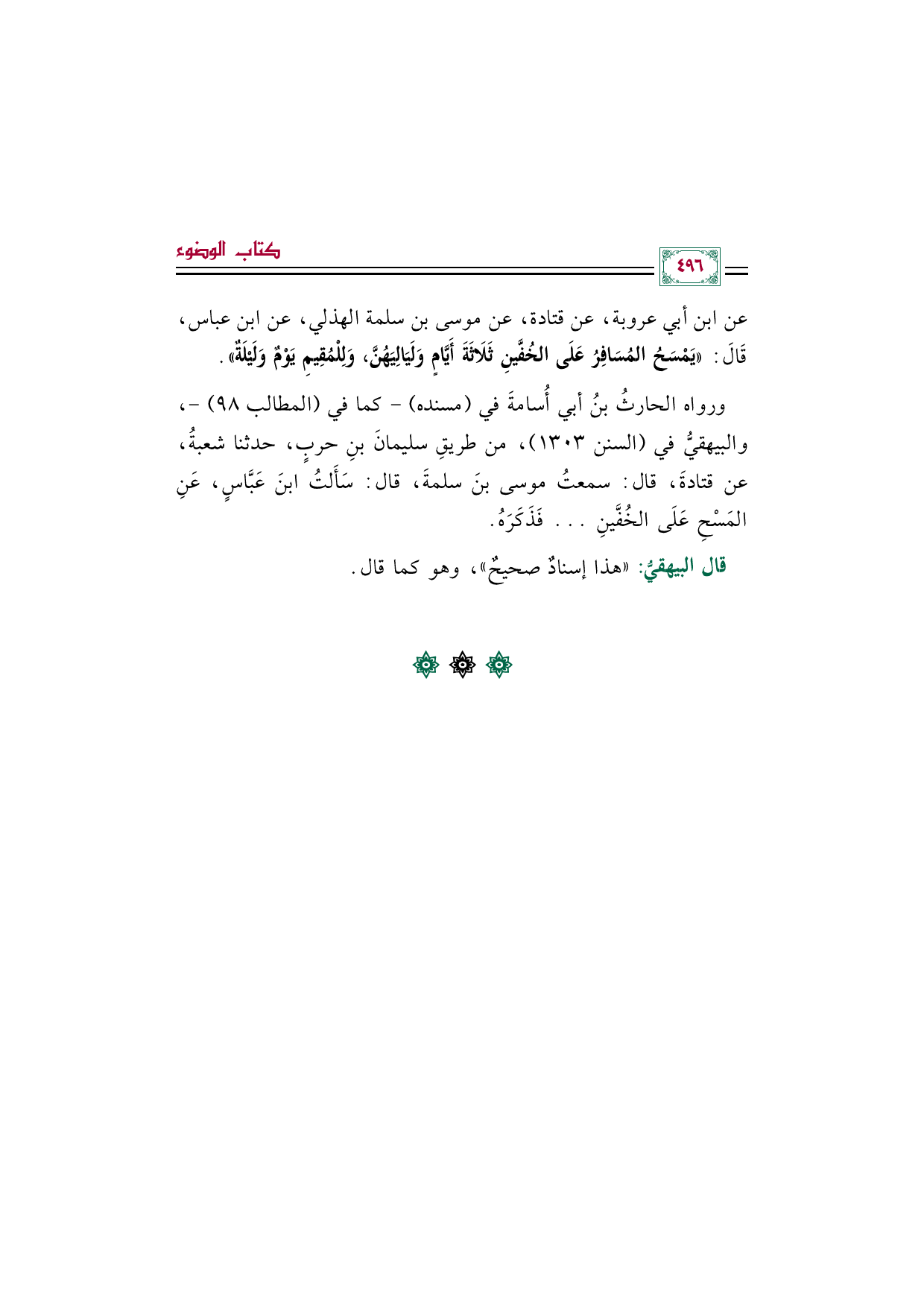 ورواه الحارثُ بنُ أبي أُسامةَ في (مسنده) -كما في (المطالب ٩٨) -، والبيهقيُّ في (السنن ١٣٠٣)، من طريقِ سليمانَ بنِ حربٍ، حدثنا شعبةُ، عن قتادةَ، قال: سمعتُ موسى بنَ سلمةَ، قال: سَالتُ ابنَ عَبَّاسٍ، عَنِ المَسْحِ عَلَى الخُفَّينِ ... فَذَكَرَهُ.
