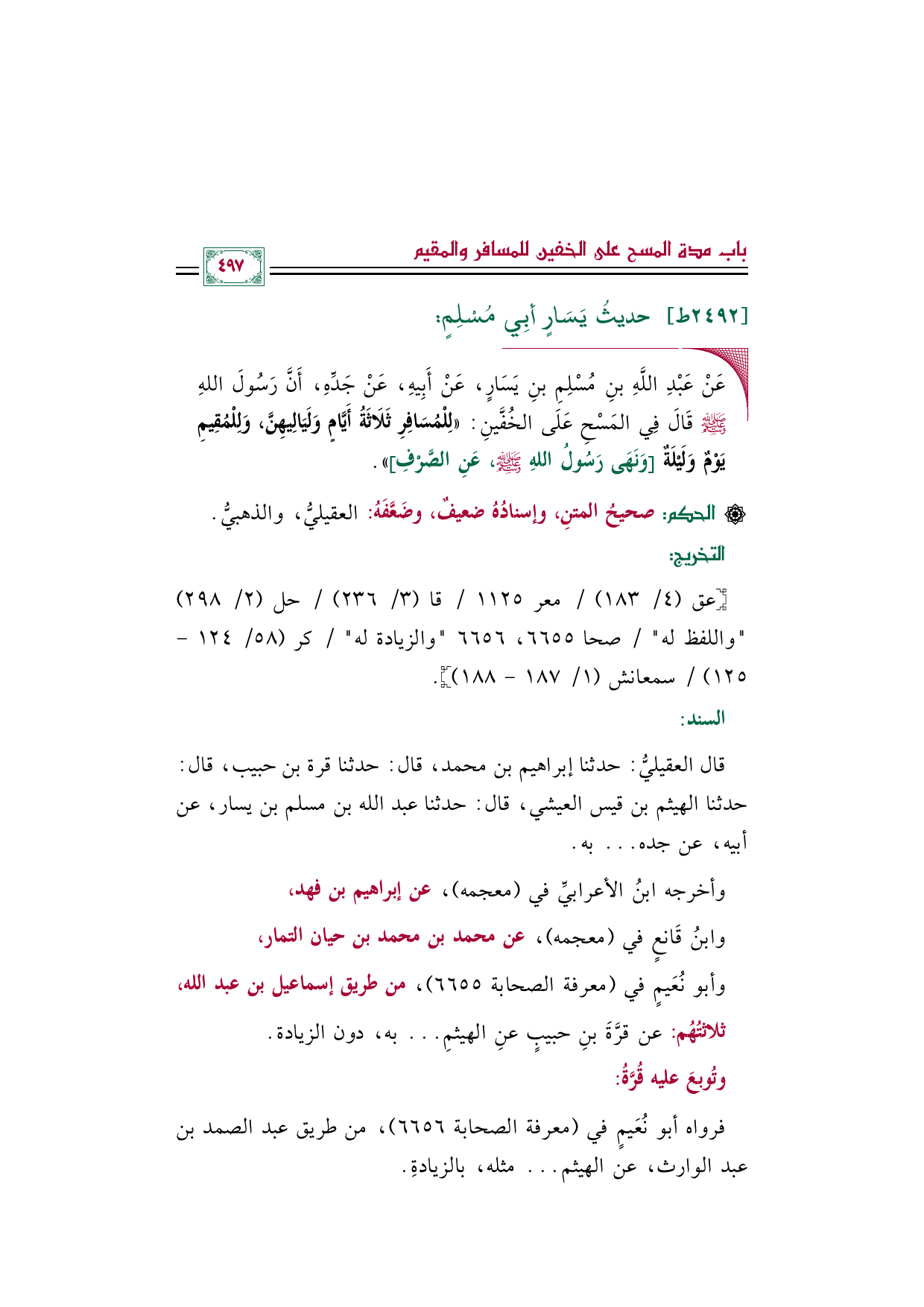 قال العقيليُّ: حدثنا إبراهيم بن محمد، قال: حدثنا قرة بن حبيب، قال: حدثنا الهيثم بن قيس العيشي، قال: حدثنا عبد الله بن مسلم بن يسار، عن أبيه، عن جده ... به.