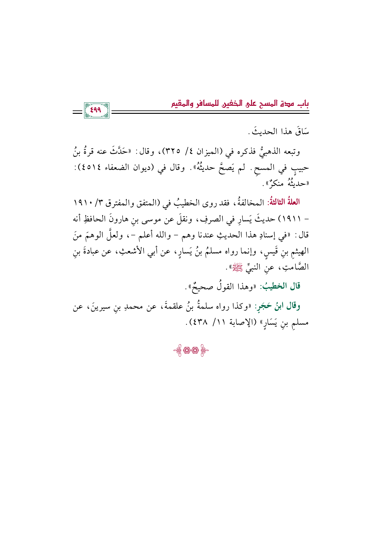 وقال ابنُ حَجَرٍ: "وكذا رواه سلمةُ بنُ علقمةَ، عن محمدِ بنِ سيرينَ، عن مسلمِ بنِ يَسَارٍ" (الإصابة ١١/ ٤٣٨).
