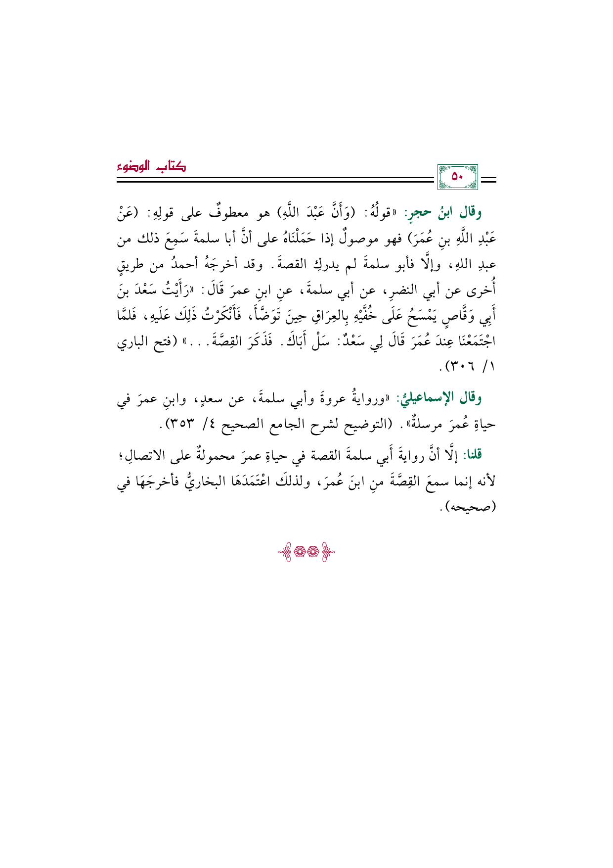 وقال ابنُ حجرٍ: ((قولُهُ: (وَأَنَّ عَبْدَ اللَّهِ) هو معطوفٌ على قولِهِ: (عَنْ عَبْدِ اللَّهِ بنِ عُمَرَ) فهو موصولٌ إذا حَمَلْنَاهُ على أنَّ أبا سلمةَ سَمِعَ ذلك من عبدِ اللهِ، وإلَّا فأبو سلمةَ لم يدركِ القصةَ. وقد أخرجَهُ أحمدُ من طريقٍ أُخرى عن أبي النضرِ، عن أبي سلمةَ، عنِ ابنِ عمرَ قَالَ: "رَأَيْتُ سَعْدَ بنَ أَبِي وَقَّاصٍ يَمْسَحُ عَلَى خُفَّيْهِ بِالعِرَاقِ حِينَ تَوَضَّأَ، فَأَنْكَرْتُ ذَلِكَ عَلَيهِ، فَلمَّا اجْتَمَعْنَا عِندَ عُمَرَ قَالَ لِي سَعْدٌ: سَلْ أَبَاكَ. فَذَكَرَ القِصَّةَ ... )) (فتح الباري ١/ ٣٠٦).