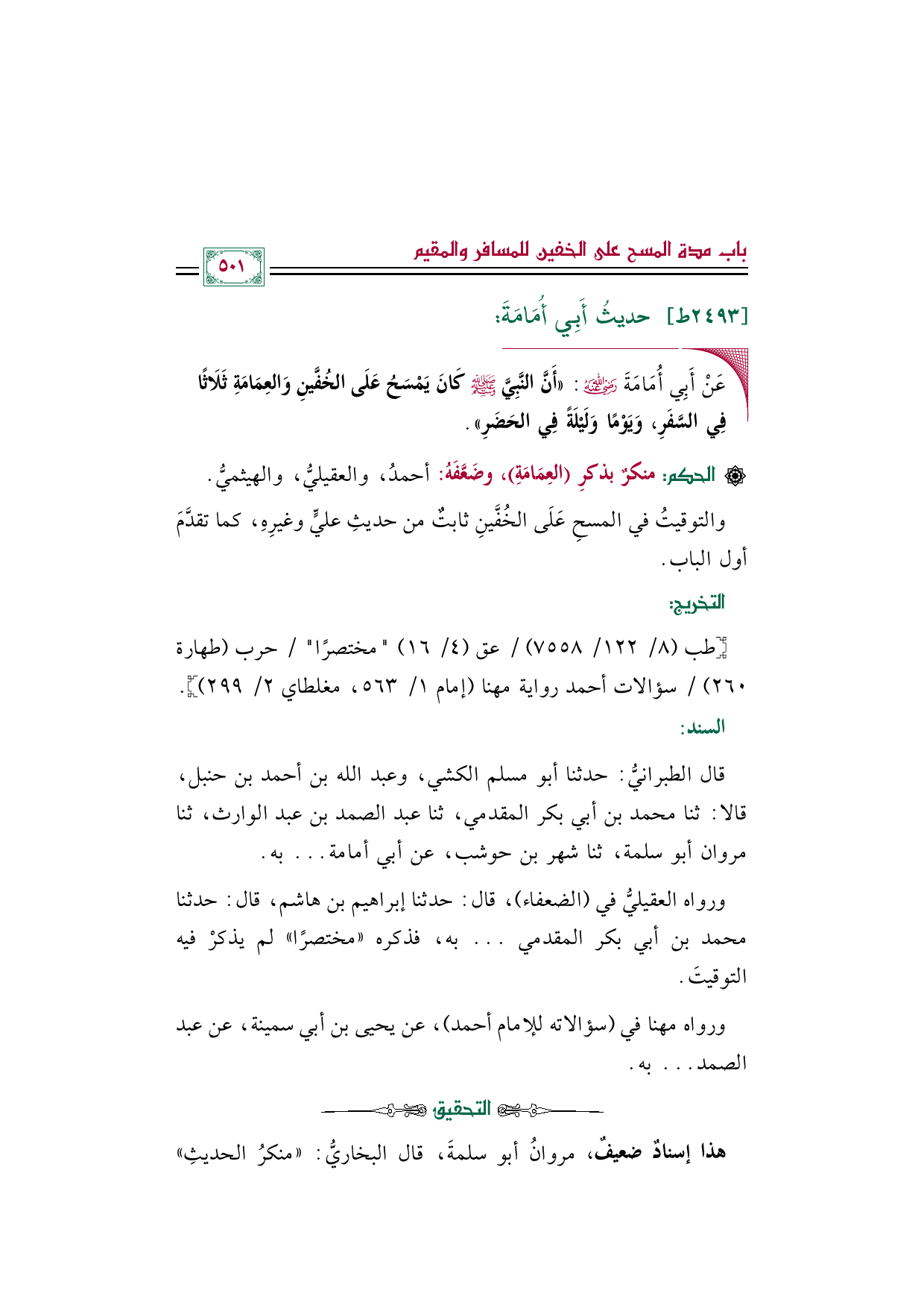 ◼ عَنْ أَبِي أُمَامَةَ رضي الله عنه: «أَنَّ النَّبِيَّ صلى الله عليه وسلم كَانَ يَمْسَحُ عَلَى الخُفَّينِ وَالعِمَامَةِ ثَلَاثًا فِي السَّفَرِ، وَيَوْمًا وَلَيْلَةً فِي الحَضَرِ».