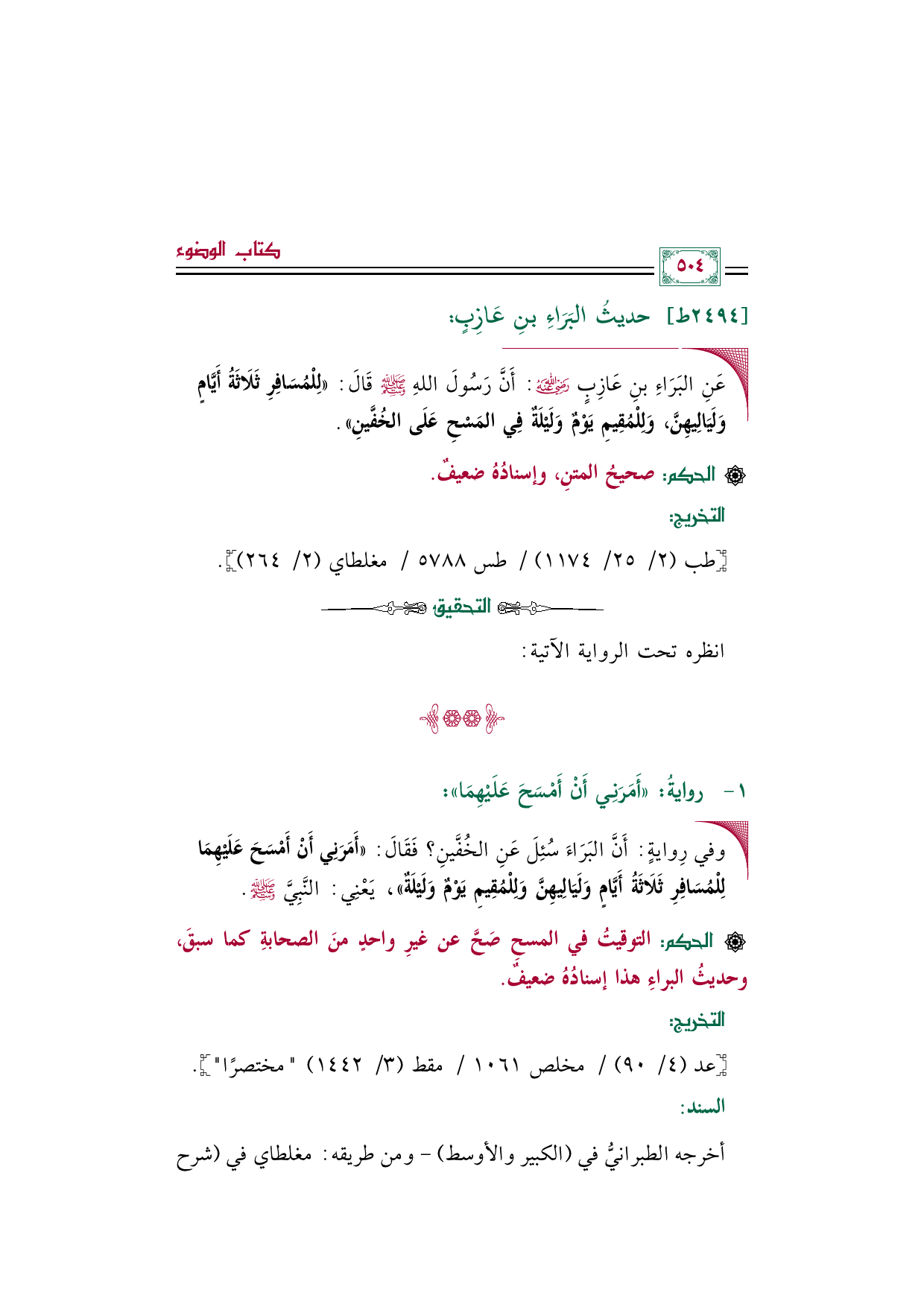[الحكم]: التوقيتُ في المسحِ صَحَّ عن غيرِ واحدٍ منَ الصحابةِ كما سبقَ، وحديثُ البراءِ هذا إسنادُهُ ضعيفٌ.