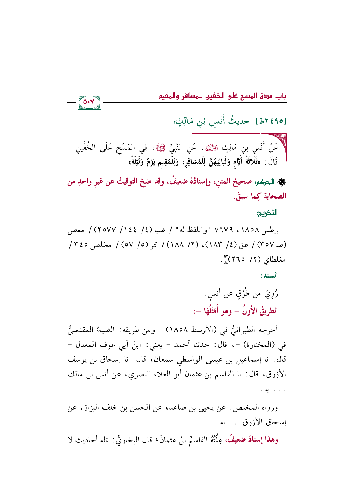 أخرجه الطبرانيُّ في (الأوسط ١٨٥٨) -ومن طريقه: الضياءُ المقدسيُّ في (المختارة) -، قال: حدثنا أحمد -يعني: ابنَ أبي عوف المعدل- قال: نا إسماعيل بن عيسى الواسطي سمعان، قال: نا إسحاق بن يوسف الأزرق، قال: نا القاسم بن عثمان أبو العلاء البصري، عن أنس بن مالك ... به.