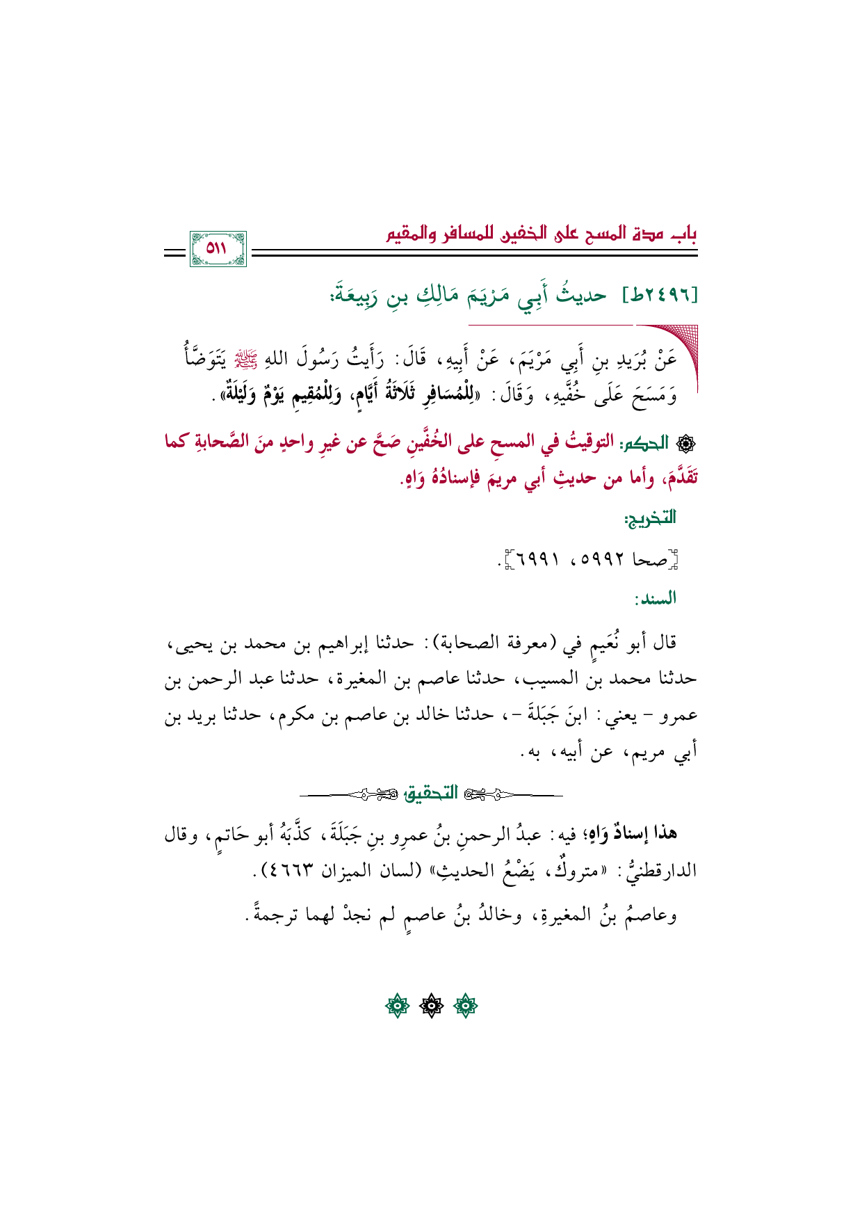 ◼ عَنْ بُرَيدِ بنِ أَبِي مَرْيَمَ، عَنْ أَبِيهِ، قَالَ: رَأَيتُ رَسُولَ اللهِ صلى الله عليه وسلم يَتَوَضَّأُ وَمَسَحَ عَلَى خُفَّيهِ، وَقَالَ: «لِلْمُسَافِرِ ثَلَاثَةُ أَيَّامٍ، وَلِلْمُقِيمِ يَوْمٌ وَلَيْلَةٌ».