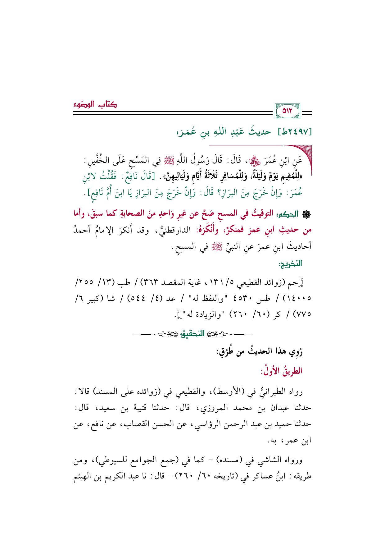 [الحكم]: التوقيتُ في المسحِ صَحَّ عن غيرِ وَاحدٍ منَ الصحابةِ كما سبقَ، وأما من حديثِ ابنِ عمرَ فمنكرٌ، وأَنْكَرَهُ الدارقطنيُّ، وقد أَنكرَ الإمامُ أحمدُ أحاديثَ ابنِ عمرَ عنِ النبيِّ صلى الله عليه وسلم في المسحِ.