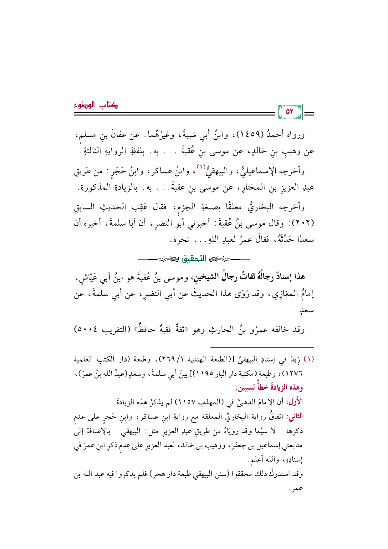 (¬١) زِيدَ في إسنادِ البيهقيِّ [(الطبعة الهندية ١/ ٢٦٩)، وطبعة (دار الكتب العلمية ١٢٧٦)، وطبعة (مكتبة دار الباز ١١٩٥)] بينَ أبي سلمةَ، وسعدٍ (عبدُ اللهِ بنُ عمرَ)، وهذه الزيادةُ خطأٌ لسببين:
