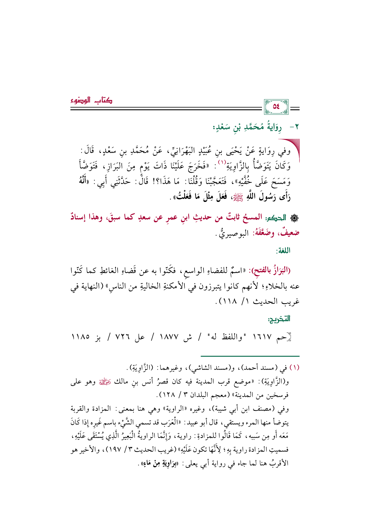 وفي (مصنف ابن أبي شيبة)، وغيره "الراوية" وهي هنا بمعنى: المزادة والقربة يتوضأ منها المرء ويستقي، قال أبو عبيد: ((الْعَرَب قد تسمي الشَّيْء باسم غَيرِه إِذا كَانَ مَعَه أَو مِن سَببه، كَمَا قَالُوا للمزادةِ: راوية، وَإِنَّمَا الراويةُ الْبَعِيرُ الَّذِي يُسْتَقَى عَلَيْهِ، فسميتِ المزادة راوية بِهِ؛ لِأَنَّهَا تكون عَلَيْهِ)) (غريب الحديث ٣/ ١٩٧)، والأخير هو الأقربُ هنا لما جاء في رواية أبي يعلى: ((بِرَاوِيَةٍ مِنْ مَاءٍ)).