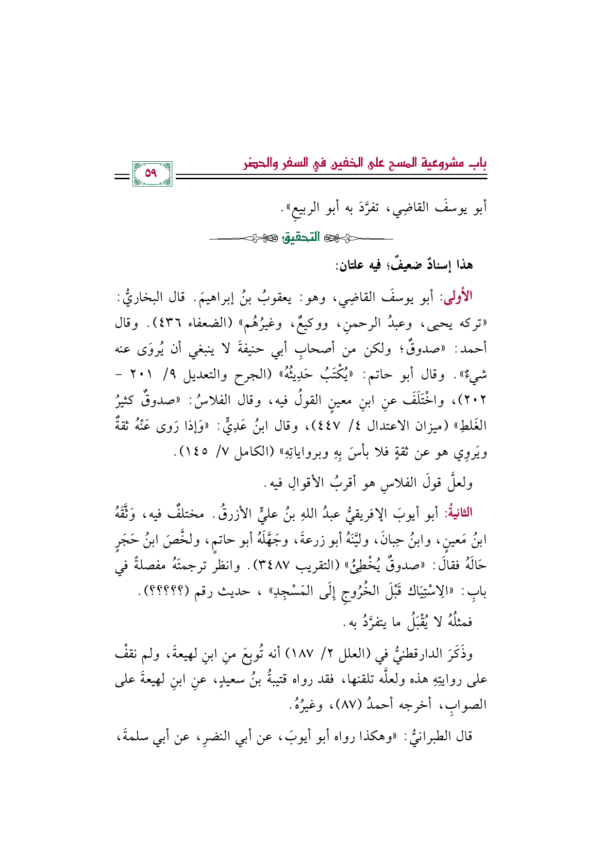 الأولى: أبو يوسفَ القاضِي، وهو: يعقوبُ بنُ إبراهيمَ. قال البخاريُّ: "تركه يحيى، وعبدُ الرحمنِ، ووكيعٌ، وغيرُهُم" (الضعفاء ٤٣٦). وقال أحمد: "صدوقٌ؛ ولكن من أصحابِ أبي حنيفةَ لا ينبغي أن يُروَى عنه شيءٌ". وقال أبو حاتم: "يُكْتَبُ حَدِيثُهُ" (الجرح والتعديل ٩/ ٢٠١ - ٢٠٢)، واخْتَلَفَ عنِ ابنِ معينٍ القولُ فيه، وقال الفلاسُ: "صدوقٌ كثيرُ الغَلطِ" (ميزان الاعتدال ٤/ ٤٤٧)، وقال ابنُ عَدِيٍّ: "وَإذا رَوى عَنْهُ ثقةٌ ويَروِي هو عن ثقةٍ فلا بأسَ بِهِ وبرواياتِهِ" (الكامل ٧/ ١٤٥).