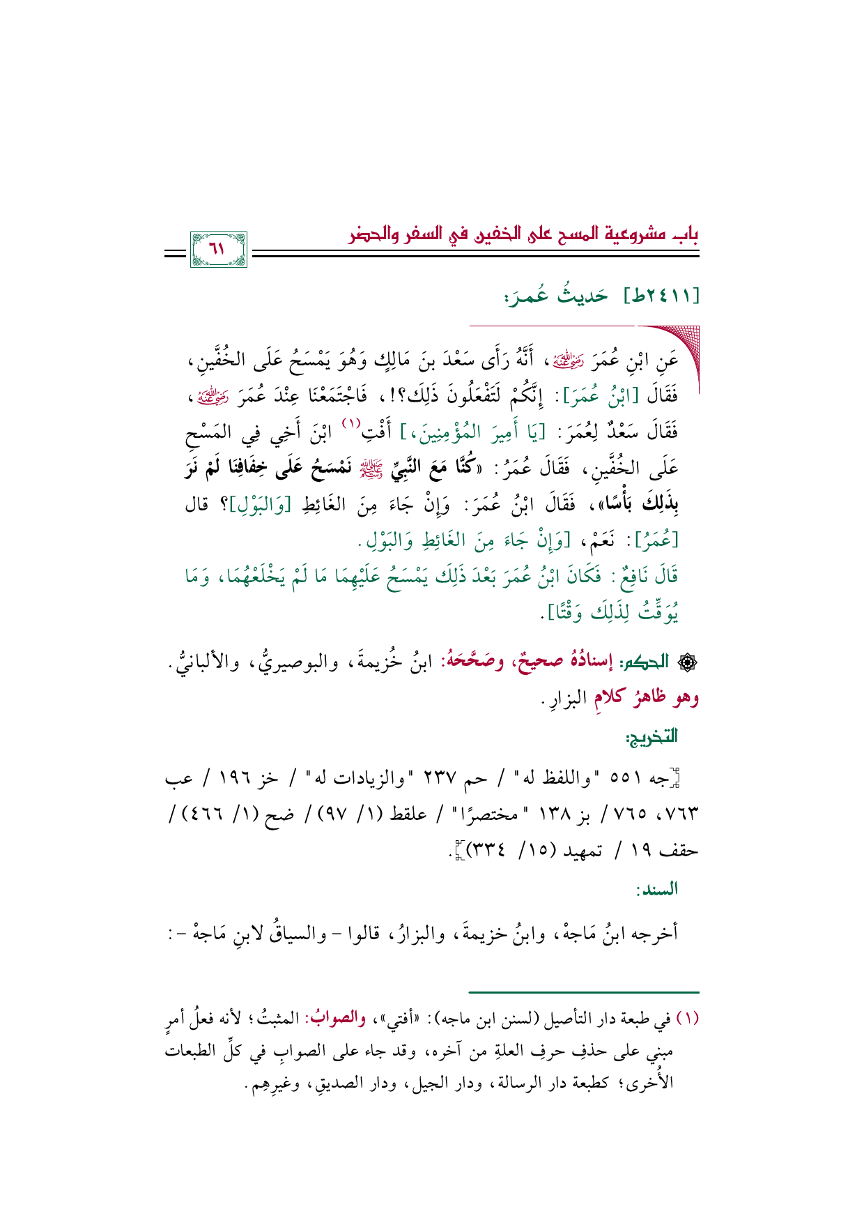 ◼ عَنِ ابْنِ عُمَرَ رضي الله عنه، أَنَّهُ رَأَى سَعْدَ بنَ مَالِكٍ وَهُوَ يَمْسَحُ عَلَى الخُفَّينِ، فَقَالَ [ابْنُ عُمَرَ]: إِنَّكُمْ لَتَفْعَلُونَ ذَلِكَ؟ ! ، فَاجْتَمَعْنَا عِنْدَ عُمَرَ رضي الله عنه، فَقَالَ سَعْدٌ لِعُمَرَ: [يَا أَمِيرَ المُؤْمِنِينَ، ] أَفْتِ (¬١) ابْنَ أَخِي فِي المَسْحِ عَلَى الخُفَّينِ، فَقَالَ عُمَرُ: ((كُنَّا مَعَ النَّبِيِّ صلى الله عليه وسلم نَمْسَحُ عَلَى خِفَافِنَا لَمْ نَرَ بِذَلِكَ بَأْسًا))، فَقَالَ ابْنُ عُمَرَ: وَإِنْ جَاءَ مِنَ الغَائِطِ [وَالبَوْلِ]؟ قال [عُمَرُ]: نَعَمْ، [وَإِنْ جَاءَ مِنَ الغَائِطِ وَالبَوْلِ.