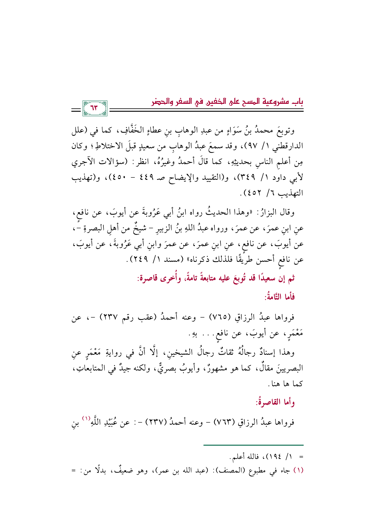 وتوبعَ محمدُ بنُ سَوَاءٍ من عبدِ الوهابِ بنِ عطاءٍ الخَفَّافِ، كما في (علل الدارقطني ١/ ٩٧)، وقد سمعَ عبدُ الوهابِ من سعيدٍ قبلَ الاختلاطِ؛ وكان مِن أعلمِ الناسِ بحديثِهِ، كما قالَ أحمدُ وغيرُهُ، انظر: (سؤالات الآجري لأبي داود ١/ ٣٤٩)، و (التقييد والإيضاح صـ ٤٤٩ - ٤٥٠)، و (تهذيب التهذيب ٦/ ٤٥٢).