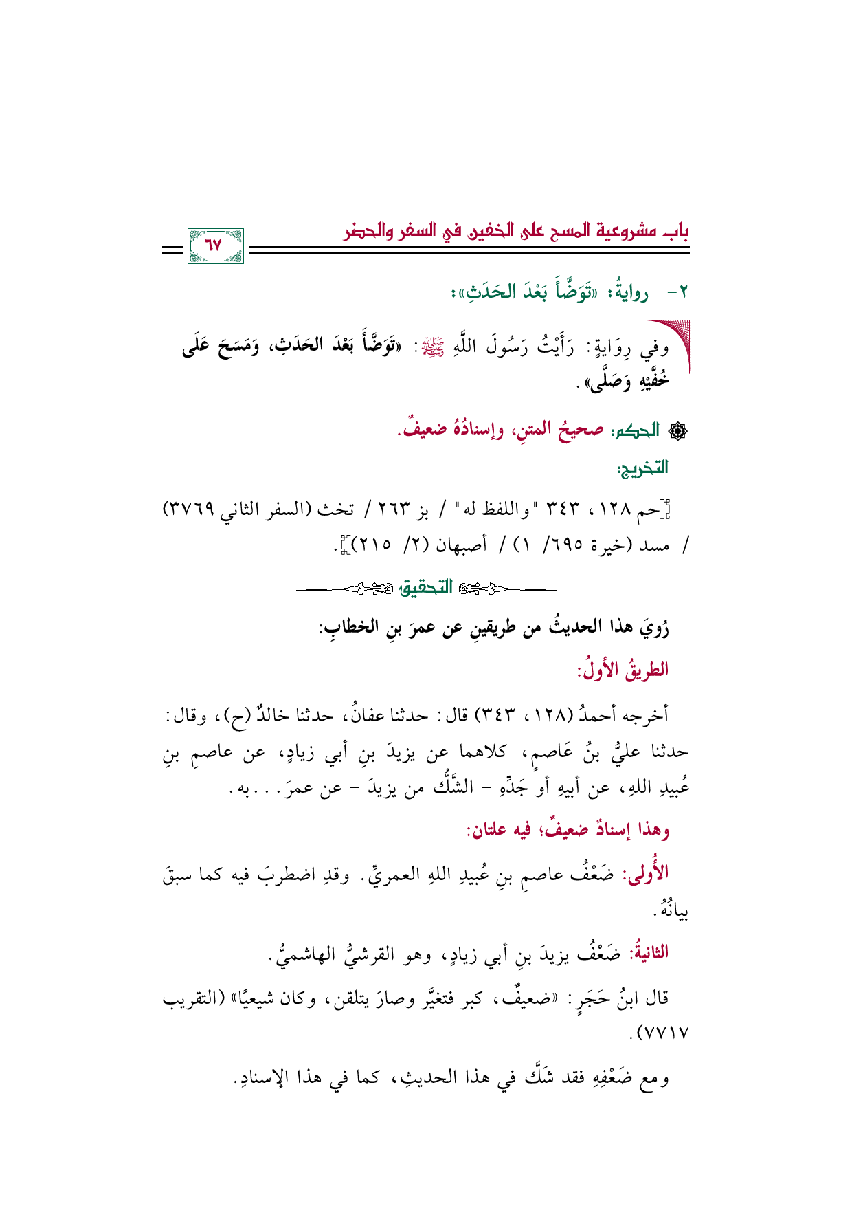 أخرجه أحمدُ (١٢٨، ٣٤٣) قال: حدثنا عفانُ، حدثنا خالدٌ (ح)، وقال: حدثنا عليُّ بنُ عَاصمٍ، كلاهما عن يزيدَ بنِ أبي زيادٍ، عن عاصمِ بنِ عُبيدِ اللهِ، عن أبيهِ أو جَدِّهِ -الشَّكُّ من يزيدَ - عن عمرَ ... به.