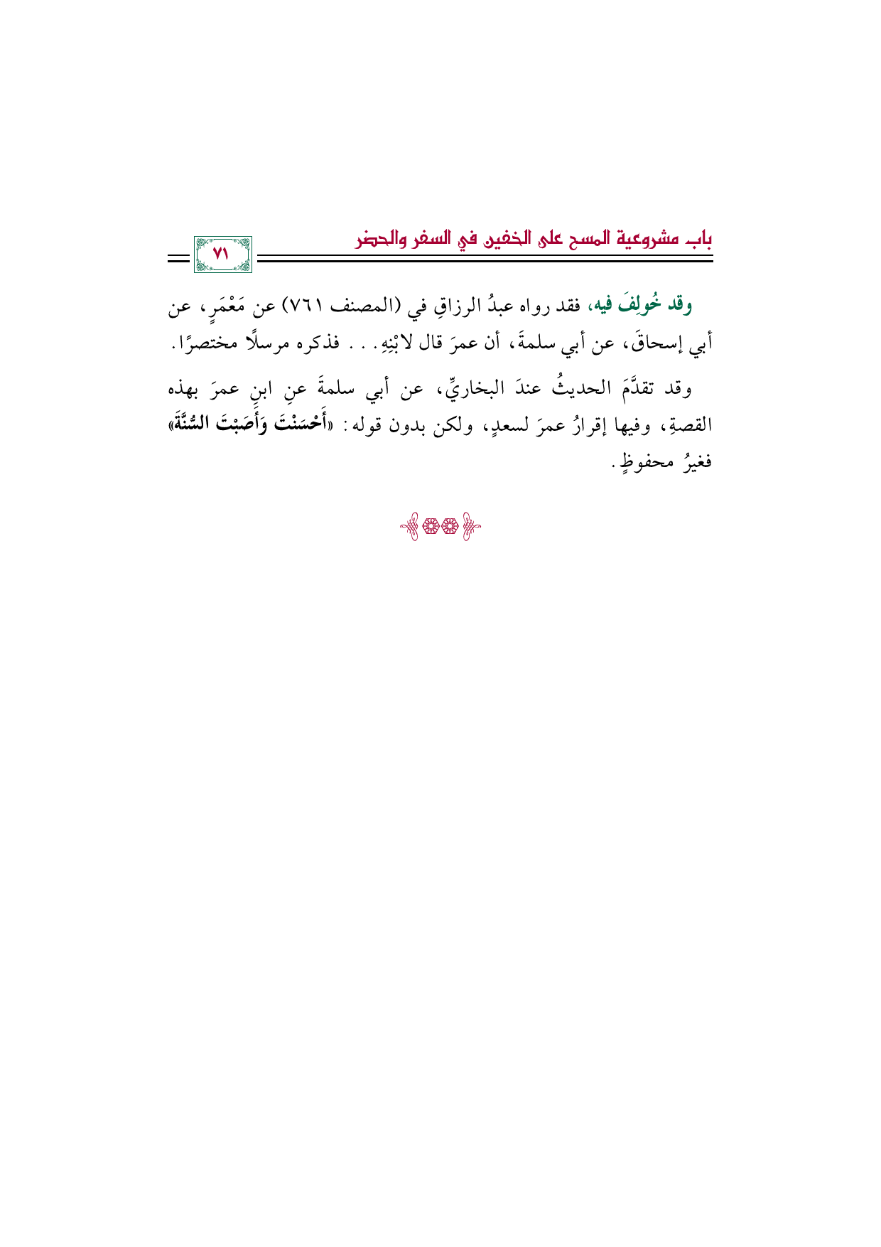 وقد تقدَّمَ الحديثُ عندَ البخاريِّ، عن أبي سلمةَ عنِ ابنِ عمرَ بهذه القصةِ، وفيها إقرارُ عمرَ لسعدٍ، ولكن بدون قوله: ((أَحْسَنْتَ وَأَصَبْتَ السُّنَّةَ)) فغيرُ محفوظٍ.