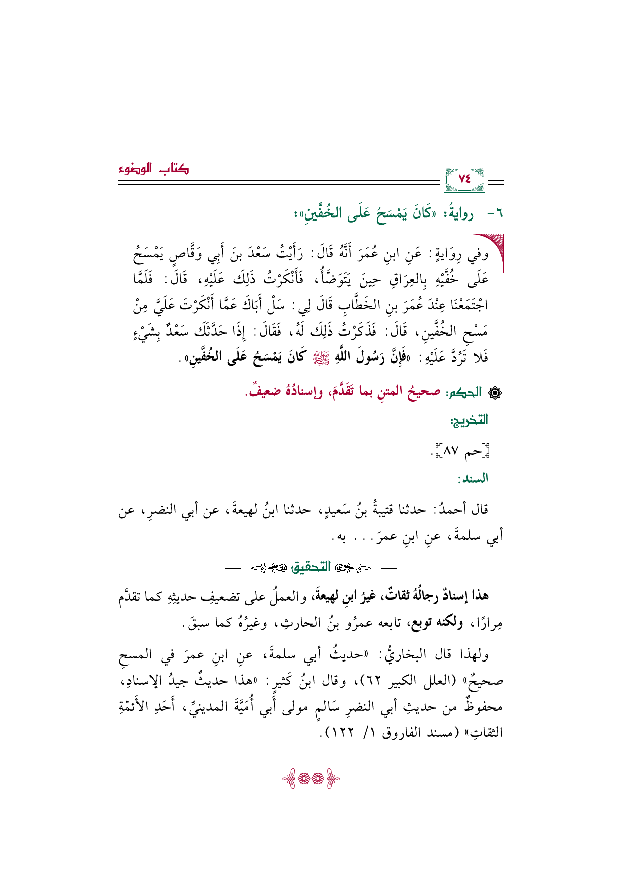 ولهذا قال البخاريُّ: "حديثُ أبي سلمةَ، عنِ ابنِ عمرَ في المسحِ صحيحٌ" (العلل الكبير ٦٢)، وقال ابنُ كَثيرٍ: "هذا حديثٌ جيدُ الإسنادِ، محفوظٌ من حديثِ أبي النضرِ سَالمٍ مولى أَبي أُميَّةَ المدينيِّ، أَحدِ الأئمّةِ الثقاتِ" (مسند الفاروق ١/ ١٢٢).