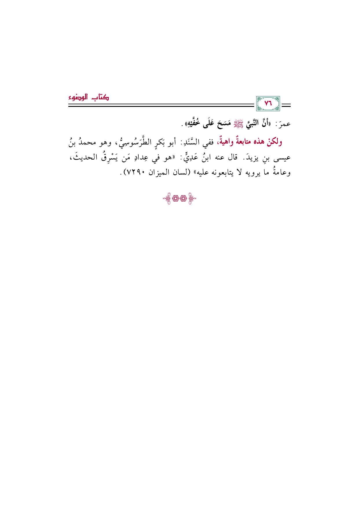 ولكنْ هذه متابعةٌ واهيةٌ، ففي السندِ: أبو بَكرٍ الطَّرَسُوسِيُّ، وهو محمدُ بنُ عيسى بنِ يزيدَ. قال عنه ابنُ عَدِيٍّ: "هو في عدادِ مَن يَسْرِقُ الحديثَ، وعامةُ ما يرويه لا يتابعونه عليه" (لسان الميزان ٧٢٩٠).