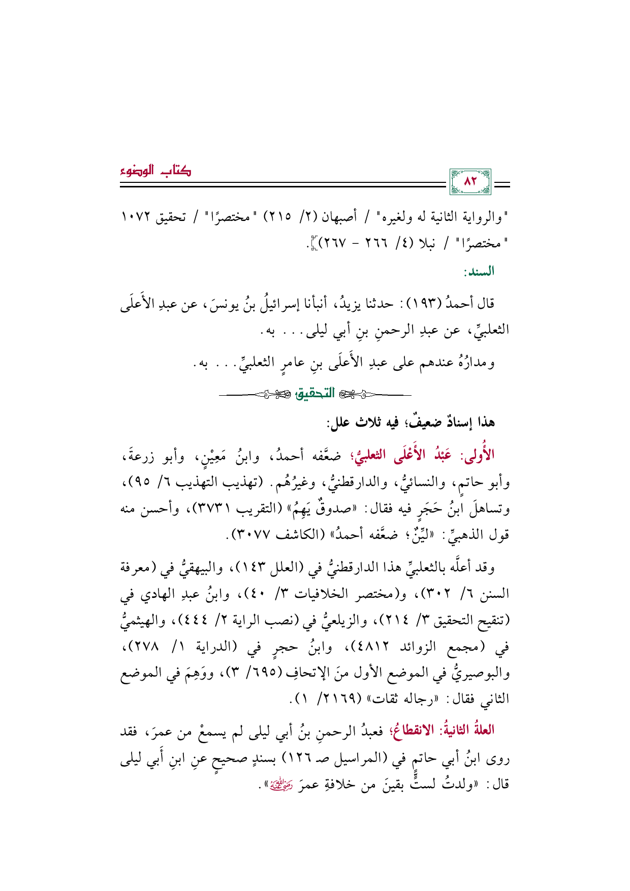قال أحمدُ (١٩٣): حدثنا يزيدُ، أنبأنا إسرائيلُ بنُ يونسَ، عن عبدِ الأَعلَى الثعلبيِّ، عن عبدِ الرحمنِ بنِ أبي ليلى ... به.