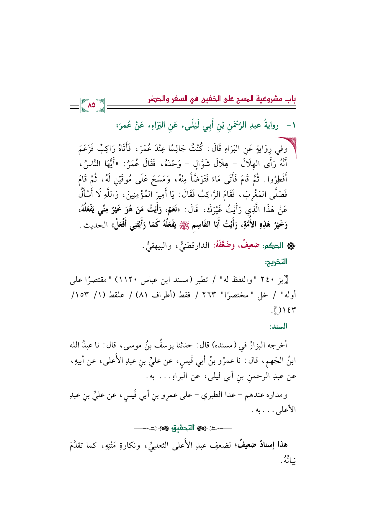أخرجه البزارُ في (مسنده) قال: حدثنا يوسفُ بنُ موسى، قال: نا عبدُ الله بنُ الجَهمِ، قال: نا عمرُو بنُ أبي قَيسٍ، عن عليِّ بنِ عبدِ الأَعلى، عن أبيهِ، عن عبدِ الرحمنِ بنِ أبي ليلى، عن البراءِ ... به.