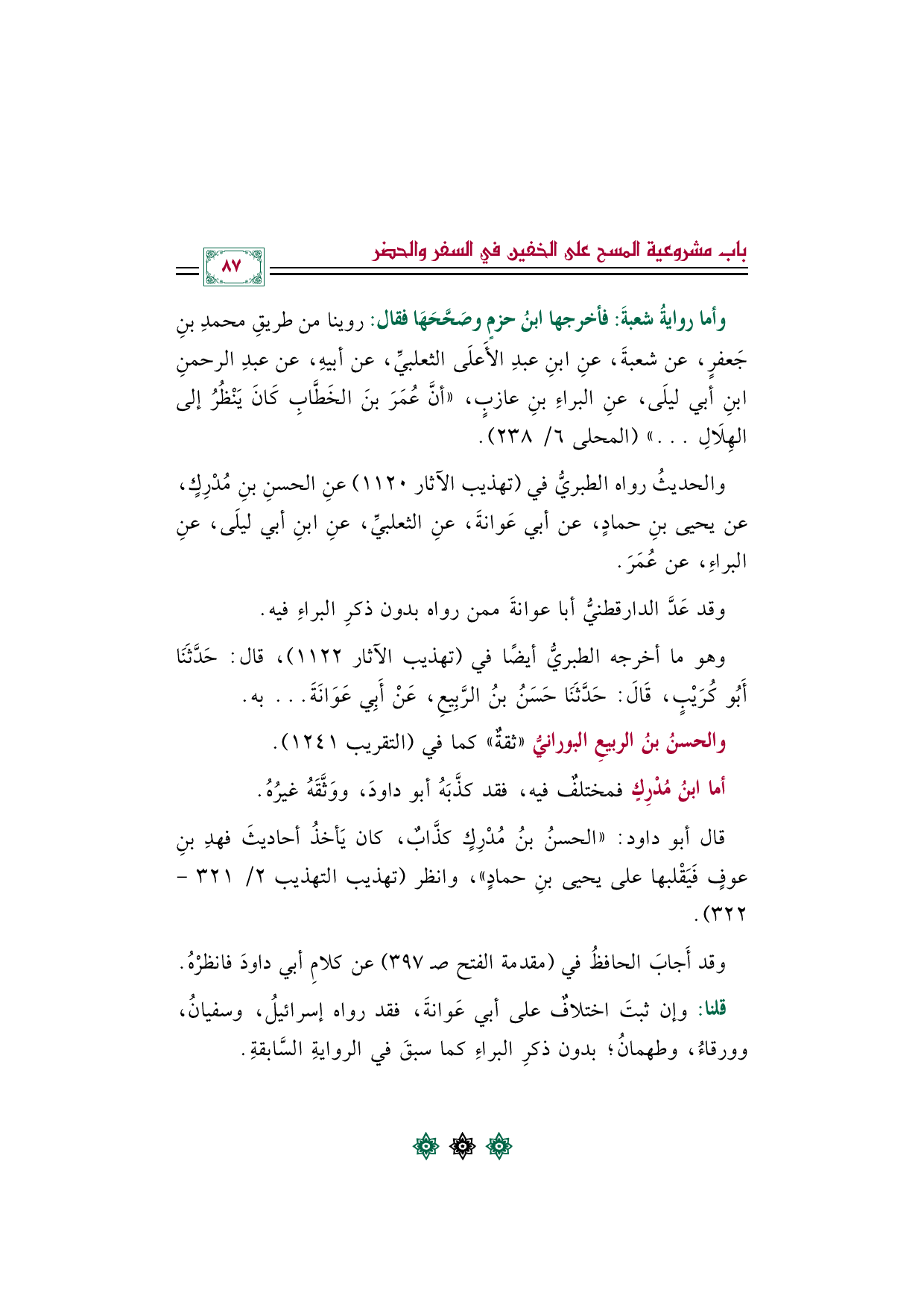 قلنا: وإن ثبتَ اختلافٌ على أبي عوانةَ، فقد رواه إسرائيلُ، وسفيانُ، وورقاءُ، وطهمانُ؛ بدون ذكرِ البراءِ كما سبقَ في الروايةِ السابقةِ.