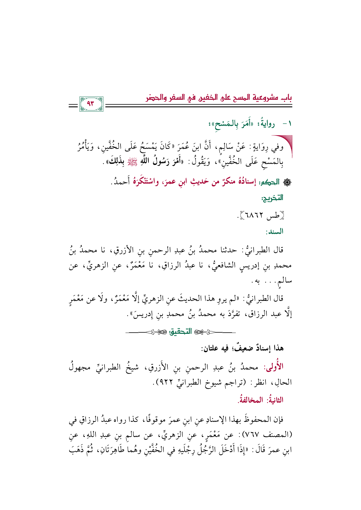 قال الطبرانيُّ: حدثنا محمدُ بنُ عبدِ الرحمنِ بنِ الأزرقِ، نا محمدُ بنُ محمدِ بنِ إدريسٍ الشافعيُّ، نا عبدُ الرزاقِ، نا مَعْمَرٌ، عن الزهريِّ، عن سالمٍ ... به.