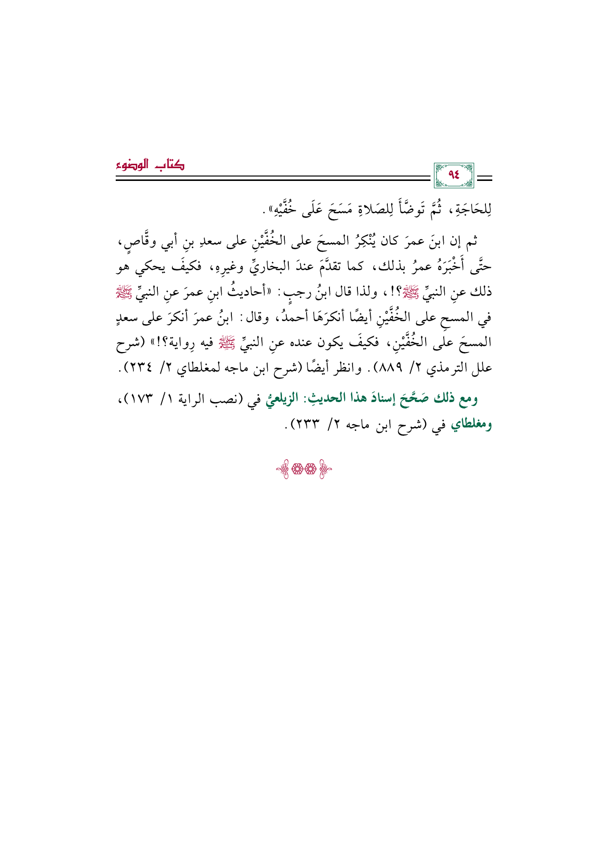 ثم إن ابنَ عمرَ كان ينكرُ المسحَ على الخُفَّيْنِ على سعدِ بنِ أبي وقَّاصٍ، حتَّى أَخْبَرَهُ عمرُ بذلك، كما تقدَّم عندَ البخاريِّ وغيرِهِ، فكيفَ يحكي هو ذلك عنِ النبيِّ صلى الله عليه وسلم؟!، ولذا قال ابنُ رجبٍ: ((أحاديثُ ابنِ عمرَ عنِ النبيِّ صلى الله عليه وسلم في المسحِ على الخُفَّيْنِ أيضًا أنكرَهَا أحمدُ، وقال: ابنُ عمرَ أنكرَ على سعدٍ المسحَ على الخُفَّيْنِ، فكيفَ يكون عنده عنِ النبيِّ صلى الله عليه وسلم فيه رِواية؟!)) (شرح علل الترمذي ٢/ ٨٨٩). وانظر أيضًا (شرح ابن ماجه لمغلطاي ٢/ ٢٣٤).