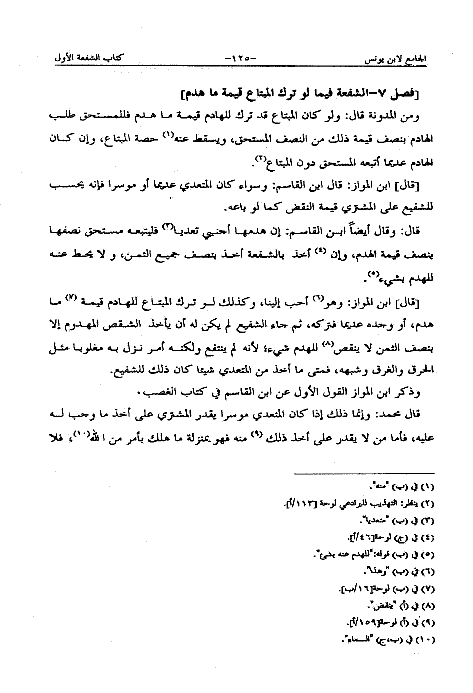 يأخذ ذلك بالشفعة إلا بالثمن كله، فإما إن كان مليئاً فللشفيع أن يحسب على المشتري قدر قيمة ذلك نقضاً يوم الشراء من قيمة العرصة من الثمن، ويتبع المشتري الهادم بقيمة ذلك قائماً يوم هدمه بالغاً ما بلغ.