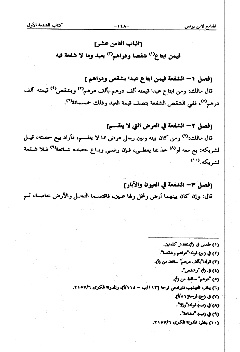 وقال ابن القاسم عن مالك في العتبية: إن الشفعة في الماء الذي يقسمه الورثة بينهم بالأقلاد وإن لم يكونوا شركاء في الأرض التي تسقى بتلك العيون والحيوان.