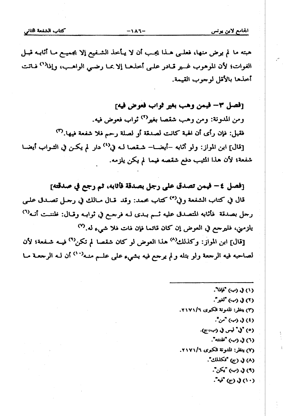 [قال] ابن المواز: وكذلك هذا العوض لو كان شقصاً لم تكن فيه شفعة؛ لأن لصاحبه فيه الرجعة ولو بتله لم يرجع فيه بشيء على علم منه أن له الرجعة ما