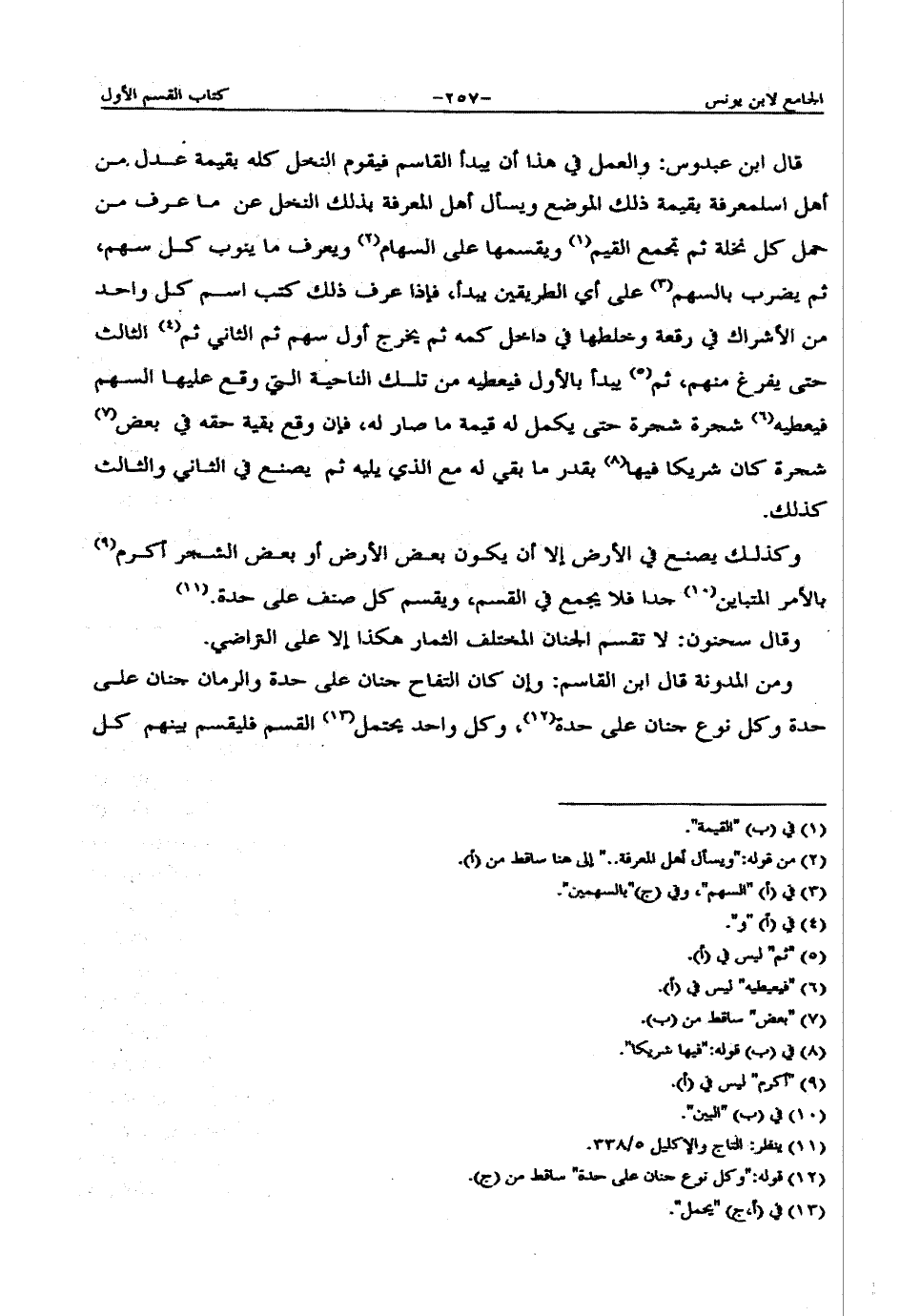 قال ابن عبدوس: والعمل في هذا أن يبدأ القاسم فيقوم النخل كله بقيمة عدل من أهل المعرفة بقيمة ذلك الموضع ويسأل أهل المعرفة بذلك النخل عن ما عرف من حمل كل نخلة ثم تجمع القيم ويقسمها السهام ويعرف ما ينوب كل سهم، ثم يضرب بالسهم على أي الطريقين يبدأ، فإذا عرف ذلك كتب اسم كل واحد من الأشراك في رقعة وخلطها في داخل كمه ثم يخرج أول سهم ثم الثاني ثم الثالث حتى يفرغ منهم، ثم يبدأ بالأول فيعطيه من تلك الناحية التي وقع عليها السهم فيعطيه شجرة شجرة حتى يكمل له قيمة ما صار له، فإن وقع بقية حق في بعض شجره كان شريكًا فيها بقدر ما بقى له مع الذي يليه ثم يصنع في الثاني والثالث كذلك.