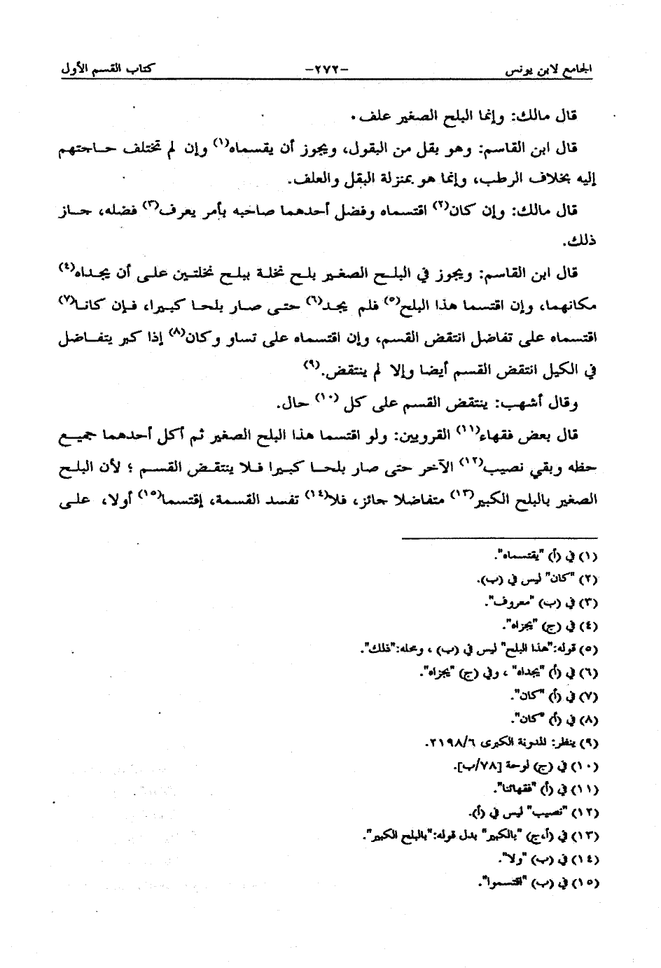 قال بعض فقهاء القرويين: ولو اقتسما هذا البلح الصغير ثم أكل أحدهما جميع حظه وبقى نصيب الآخر حتى صار بلحًا كبيرًا فلا ينتقض القسم؛ لأن البلح الصغير بالبلح الكبير متفاضلًا جائز، فلا تفسد القسمة، إقتسما أولًا، على