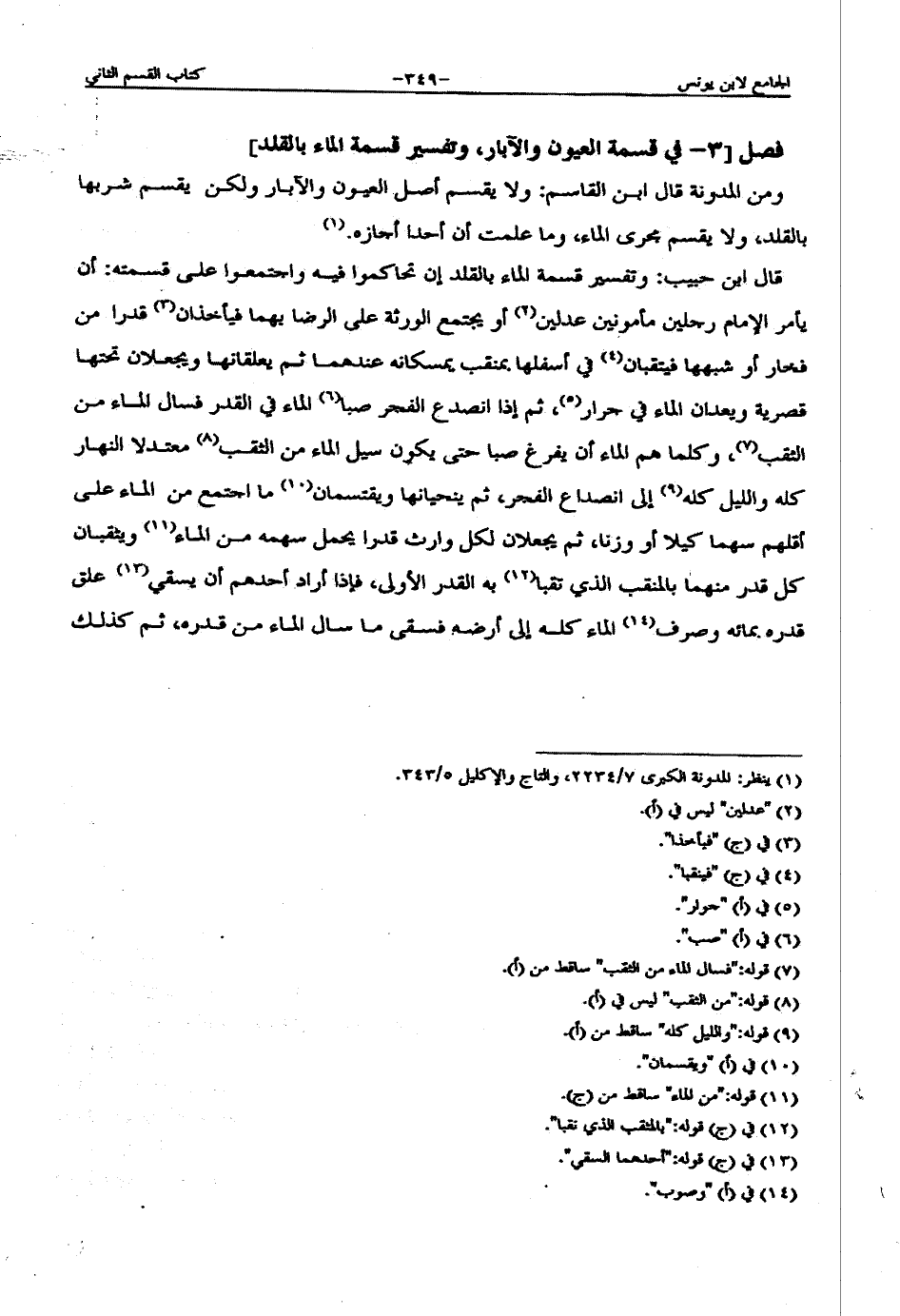 ومن المدونة قال ابن القاسم: ولا يقسم أصل العيون والآبار ولكن يقسم شربها