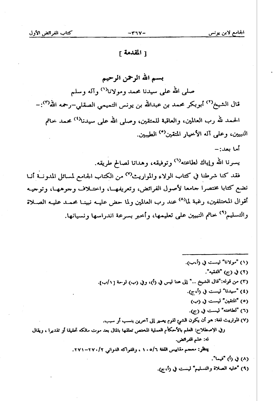 فقد كنا شرطنا في كتاب الولاء والمواريث من الكتاب الجامع لمسائل المدونة أنا نضع كتابا مختصراً جامعا لأصول الفرائض، وتعريفها، واختلاف وجوهها، وتوجيه أقوا المختلفين، رغبة لما عند رب العالمين ولما حض عليه نبينا محمد عليه الصلاة والتسيم خاتم النبين على تعليمها، وأخير بسرعة اندارسها ونسيانها.
