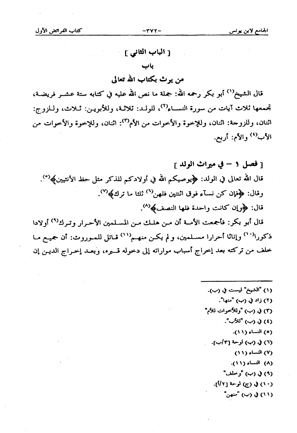 قال الشيخ أبو بكر رحمه الله: جملة ما نص الله عليه في كتابه ستة عشر فريضة، تجمعها ثلاث آيات من سورة النساء، للولد: ثلاثة، وللأبوين: ثلاث، وللزوج: اثنان، وللزوجة: اثنان، وللإخوة والأخوات من الأم: اثنان، وللإخوة والأخوات من الأب والأم: أربع.