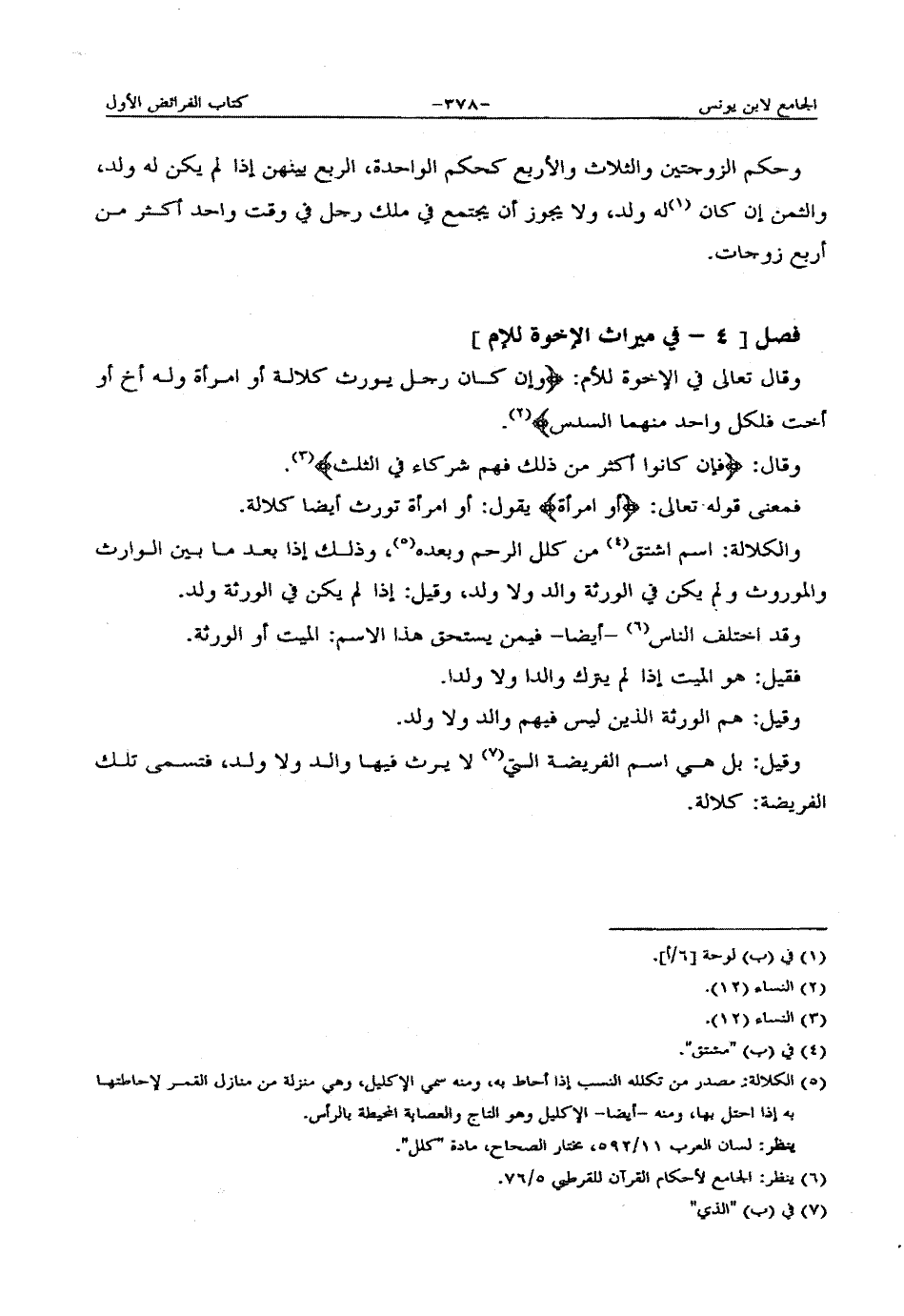 وقال تعالى في الإخوة للأم: {وَإِنْ كَانَ رَجُلٌ يُورَثُ كَلالَةً أَوِ امْرَأَةٌ وَلَهُ أَخٌ أَوْ أُخْتٌ فَلِكُلِّ وَاحِدٍ مِنْهُمَا السُّدُسُ}.