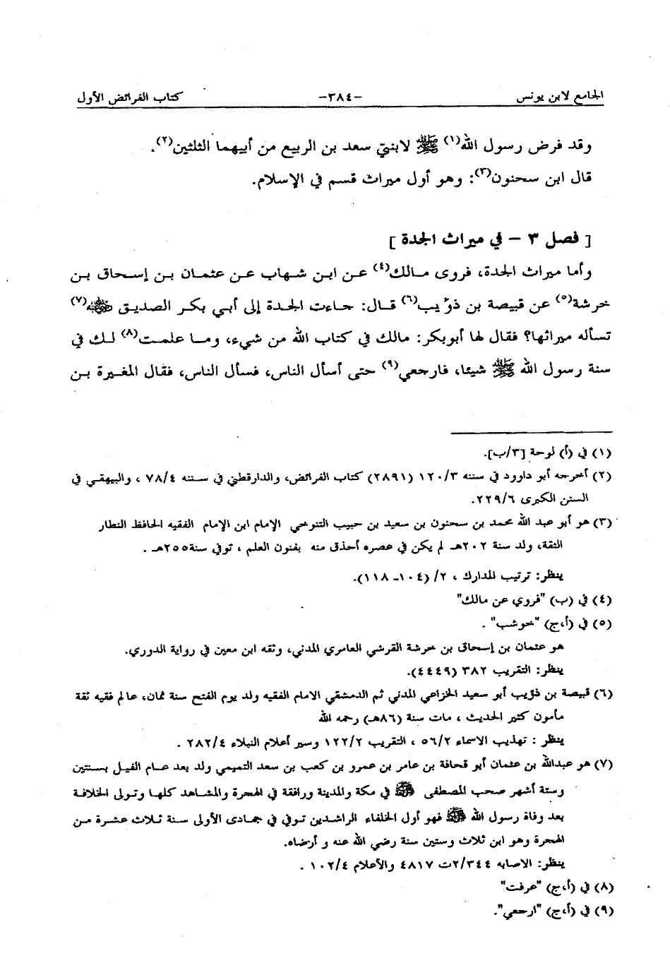 وأما ميراث الجدة، فروى مالك عن ابن شهاب عن عثمان بن إسحاق بن خرشة عن قبيصة بن ذؤيب قال: جاءت الجدة إلى أبي بكر الصديق رضي الله عنه تسأله ميراثها؟ فقال لها أبو بكر: مالك في كتاب الله من شيء، وما علمت لك في سنة رسول الله صلى الله عليه وسلم شيئا، فارجعي حتى اسأل الناس، فسأل الناس، فقال المغيرة بن