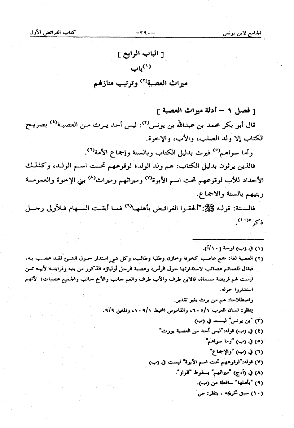 قال أبو بكر محمد بن عبد الله بن يونس: ليس أحد يرث من العصبة بصريح الكتاب إلا ولد الصلب، والأب، والإخوة.