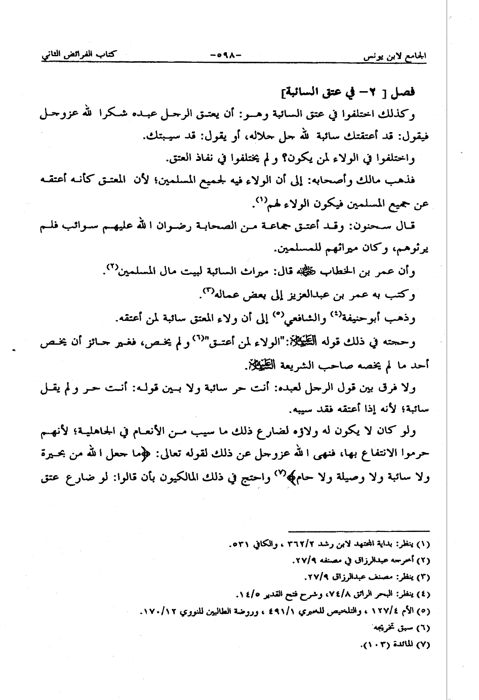 وأن عمر بن الخطاب -رضي الله عنه- قال: ميراث السائبة لبيت مال المسلمين.