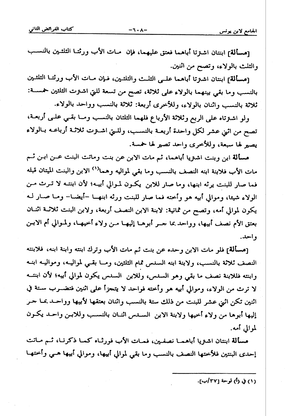 مسألة ابن وبنت اشترتا أباهما، ثم مات الابن عن بنت وماتت البنت عن ابن ثم مات الأب فلابنة ابنه النصف بالنسب وما بقي لمواليه وهما الابن والبنت الميتان قبله فما صار للبنت يرثه ابنها، وما صار للابن يكون لموالي أبيه؛ لأن ابنته لا ترث من الولاء شيئاً، وموالي أبيه هو وأخته فما صار للبنت ورثه ابنها - أيضاً- وما صار له يكون لموالي أمه، وتصح من ثمانية: لابنه الابن النصف أربعة، ولابن البنت ثلاثة اثنان بعتق الأم نصف أبيها، وواحد بما جر أبوها إليها من ولاء أخيها، ولموالي أم الابن واحد.