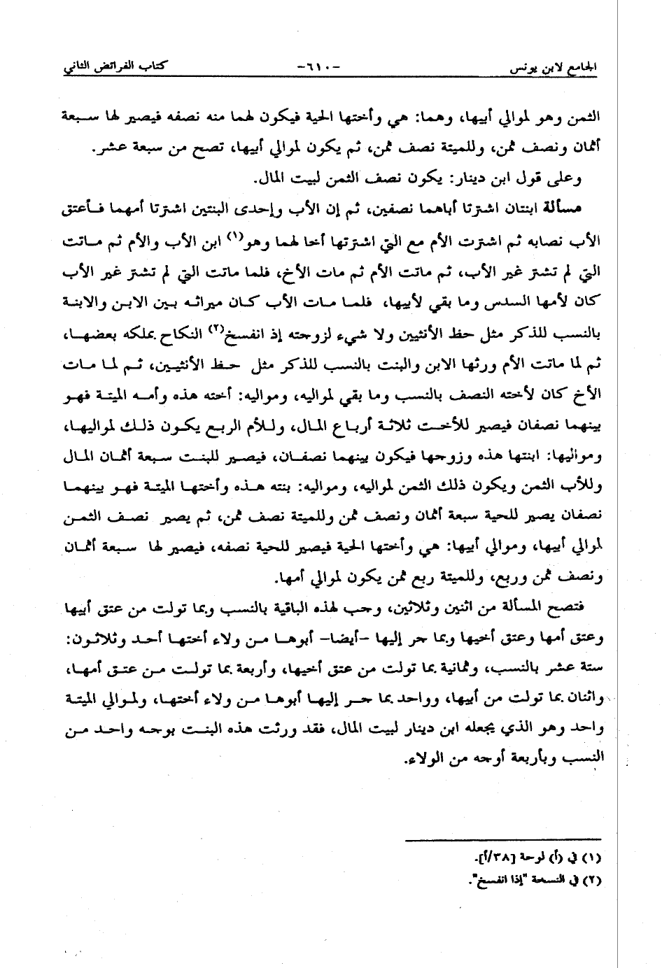 فتصح المسألة من اثنين وثلاثين، وجب لهذه الباقية بالنسب وبما تولت من عتق أبيها وعتق أمها وعتق أخيها وبما جر إليها -أيضاً- أبوها من ولاء أختها أحد وثلاثون: ستة عشر بالنسب، وثمانية بما تولت من عتق أخيها، وأربعة بما تولت من عتق أمها، واثنان بما تولت من أبيها، وواحد بما جر غليها أبوها من ولاء أختها، ولموالي الميتة واحد وهو الذي يجعله ابن دينار لبيت المال، فقد ورثت هذه البنت بوجه واحد من النسب وبأربعة أوجه من الولاء.