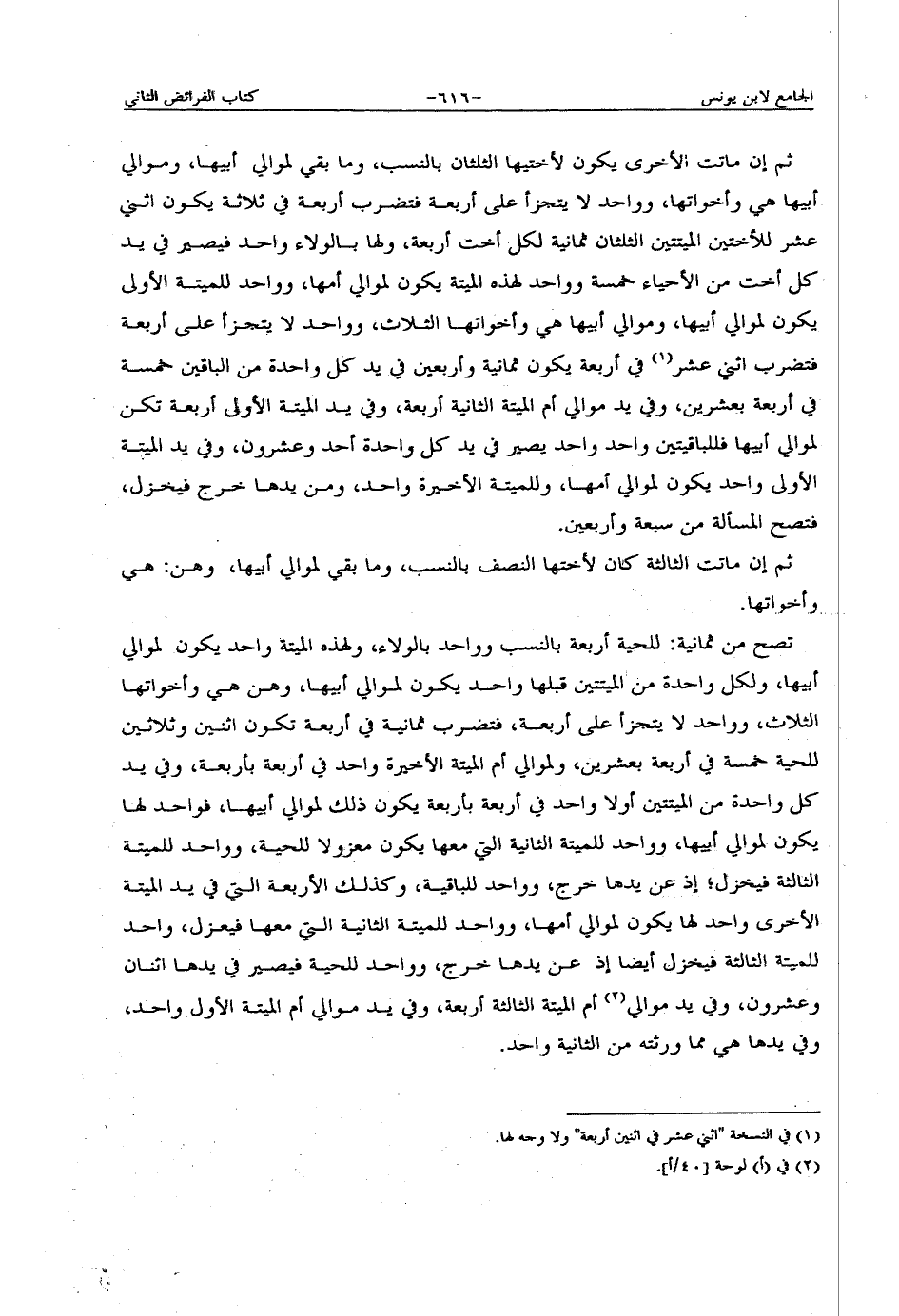 ثم إن ماتت الأخرى يكون لأختيها الثلثان بالنسب، وما بقي لموالي أبيها، وموالي أبيها هي وأخواتها، وواحد لا يتجزأ على أربعة فتضرب أربعة في ثلاثة يكون اثنى عشر للأختين الميتتتين الثلثان ثمانية لكل أخت أربعة، ولها بالولاء واحد فيصير في يد كل أخت من الأحياء خمسة وواحد لهذا الميتة يتكون لموالي أمها، وواحد للميتة الأولى يكون لموالي أبيها، وموالي أبيها هي وأخواتها الثلاث، وواحد لا يتجزأ على أربعة فتضرب اثنى عشر في أربعة يكون ثمانية وأربعين في يد كل واحدة من الباقين خمسة في أربعة بعشرين، وفي يد موالي أم الميتة الثانية أربعة، وفي يد الميتة الأولى اربعة تكن لموالي أبيها فللباقيتين واحد واحد يصير في يد كل واحدة أحد وعشرون، وفي يد الميتة الأولى واحد يكون لموالي أمها، وللميتة الأخيرة واحد، ومن يدها خرج فيخزل، فتصح المسألة من سبعة وأربعين.
