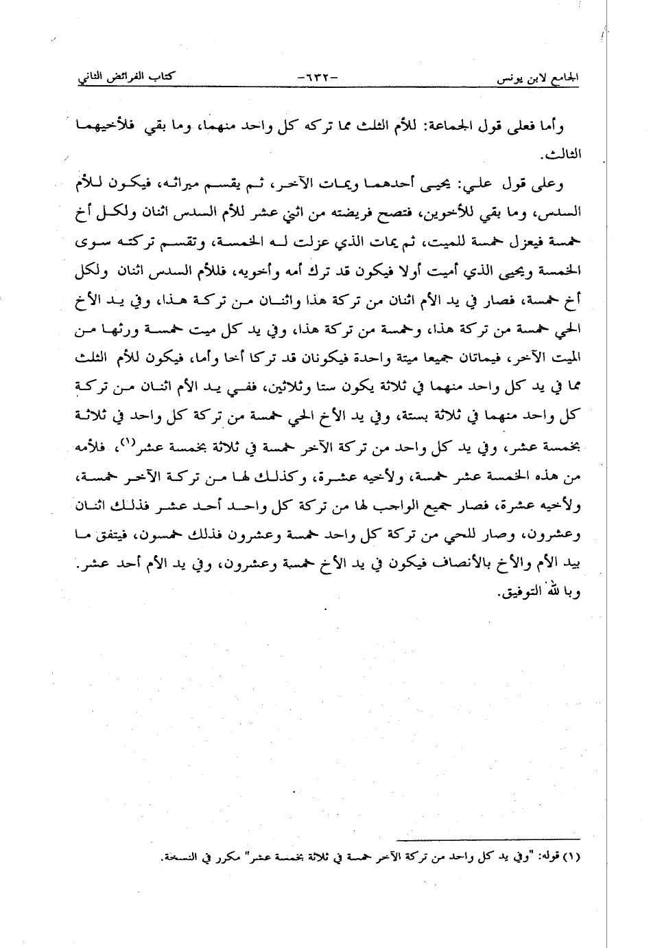 وعلى قول علي: يحيى أحدهما ويمات الآخر، ثم يقسم ميراثه، فيكون للأم السدس، وما بقي للأخوين، فتصح فريضة من اثني عشر للأم السدس اثنان ولكل أخ خمسة فيعزل خمسة للميت، ثم يمات الذي عزلت له الخمسة، وتقسم تركته سوى الخمسة ويحيى الذي أميت أولاً فيكون قد ترك أمه وأخويه، فللأم السدس اثنان ولكل أخ خمسة، فصار في يد الأم اثنان من تركة هذا واثنان من تركة هذا، وفي يد الأخ الحي خمسة من تركة هذا، وخمسة من تركة هذا، وفي يد كل ميت خمسة ورثها من الميت الآخر، فيماتان جميعاً ميتة واحدة فيكونان قد تركا أخاً وأماً، فيكون للأم الثلث مما في يد كل واحد منهما في ثلاثة يكون ستاً وثلاثين، ففي يد الأم اثنان من تركة كل واحد منهما في ثلاثة بستة، وفي يد الأخ الحي خمسة من تركة كل واحد في ثلاثة بخمسة عشر، وفي يد كل واحد من تركة الآخر خمسة في ثلاثة بخمسة عشر، فلأمه من هذه الخمسة عشر خمسة، ولأخيه عشرة، وكذلك لها من تركة الآخر خمسة، ولأخيه عشرة، فصار جميع الواجب لها من تركة كل واحد أحد عشر فذلك اثنان وعشرون، وصار للحي من تركة كل واحد خمسة وعشرون فذلك خمسون، فيتفق ما بيد الأم والأخ بالأنصاف فيكون في يد الأخ خمسة وعشرون، وفي يد الأم أحد عشر. وبالله التوفيق.