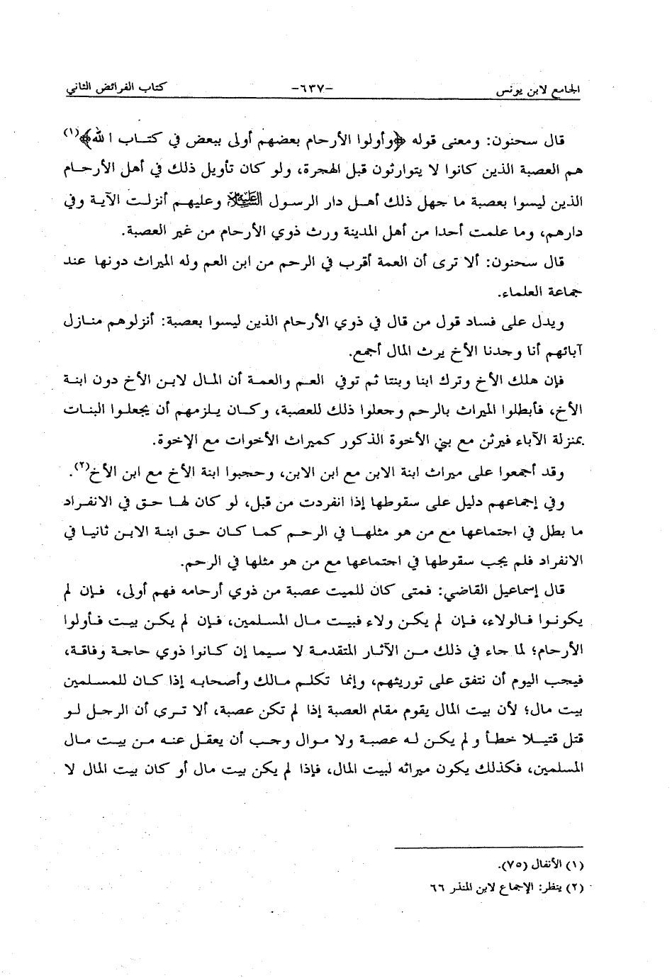 قال سحنون: ومعنى قوله: {وَأُوْلُوا الأَرْحَامِ بَعْضُهُمْ أَوْلَى بِبَعْضٍ فِي كِتَابِ اللَّهِ} [الأنفال:75] هم العصبة الذين كانوا لا يتوارثون قبل الهجرة، ولو كان تأويل ذلك في أهل الأرحام الذين ليسوا بعصبة ما جهل ذلك أهل دار الرسول -عليه السلام- وعليهم أنزلت الآية وفي دارهم، وما علمت أحداً من أهل المدينة ورث ذوي الأرحام من غير العصبة.