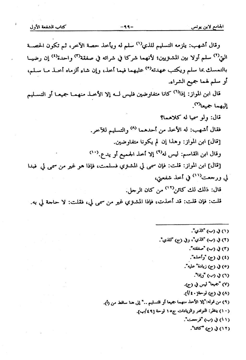 م: صواب؛ لأنه لما لم يسأل عن المشتري لم يكن له به حجة، وإن سمى له المشتري ثم تبين أنه غيره، لزمه الأخذ ولم يلزمه التسليم؛ لأنه في التسليم يقول: رضيت شركة هذا لخيره وأمانته، فإذا تبين أنه غيره لم أرض مشاركته إذ لا أعلم حاله، أو لأنه شرير.