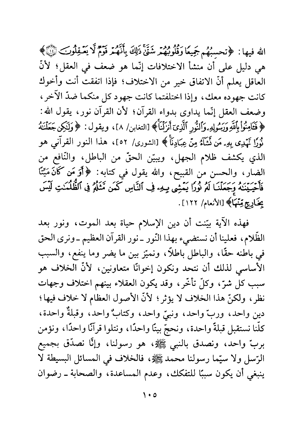 الله فيها: {تَحْسَبُهُمْ جَمِيعًا وَقُلُوبُهُمْ شَتَّى ذَلِكَ بِأَنَّهُمْ قَوْمٌ لَا يَعْقِلُونَ} [الحشر: 14] هي دليل على أن منشأ الاختلافات إنّما هو ضعف في العقل؛ لأنّ العاقل يعلم أن الاتفاق خير من الاختلاف؛ فإذا اتفقت أنت وأخوك كانت جهوده معك، وإذا اختلفتما كانت جهود كل منكما ضدّ الآخر، وضعف العقل إنما يداوى بدواء القرآن؛ لأن القرآن نور، يقول الله: {فَآمِنُوا بِاللَّهِ وَرَسُولِهِ وَالنُّورِ الَّذِي أَنْزَلْنَا} [التغابن: 8]، ويقول: {وَلَكِنْ جَعَلْنَاهُ نُورًا نَهْدِي بِهِ مَنْ نَشَاءُ مِنْ عِبَادِنَا} [الشورى: 52]، هذا النور القرآني هو الذي يكشف ظلام الجهل، ويبيّن الحق من الباطل، والنّافع من الضار، والحسن من القبيح، والله يقول في كتابه: {أَوَمَنْ كَانَ مَيتًا فَأَحْيَينَاهُ وَجَعَلْنَا لَهُ نُورًا يَمْشِي بِهِ فِي النَّاسِ كَمَنْ مَثَلُهُ فِي الظُّلُمَاتِ لَيسَ بِخَارِجٍ مِنْهَا} [الأنعام: 122].